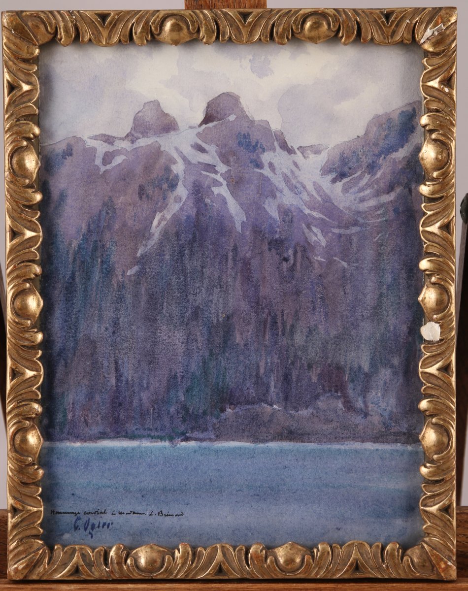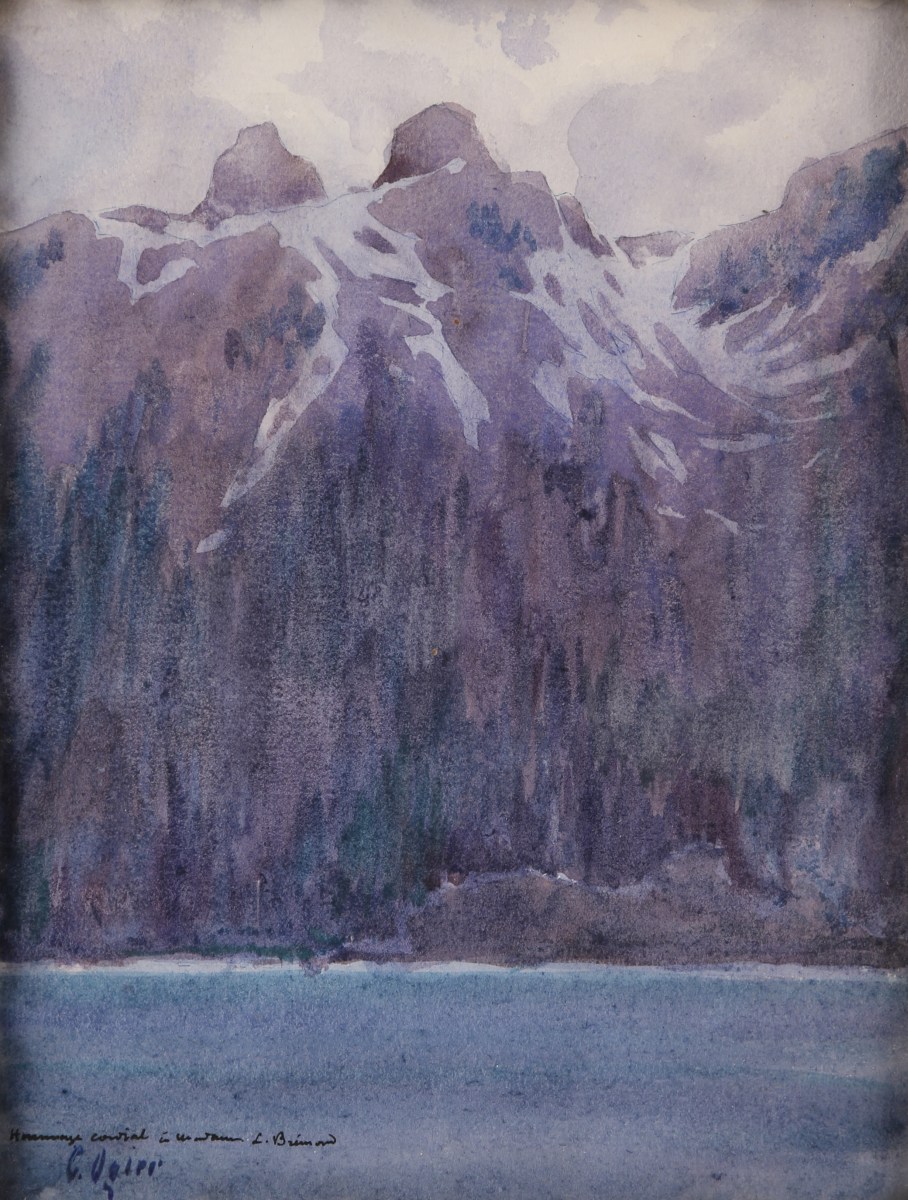 - Montagne, aquarelle signée et envoi en bas à gauche, E. Ogier ? 21 x 16,5 cm.