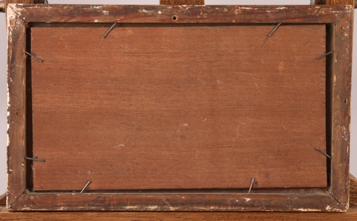 Panneau signé en bas à gauche. Haut. 12, Larg. 21,5 cm.