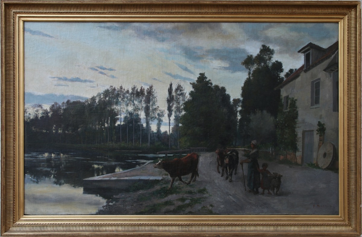 Moulin au bord de l'eau animé d'une paysanne et de ses vaches.