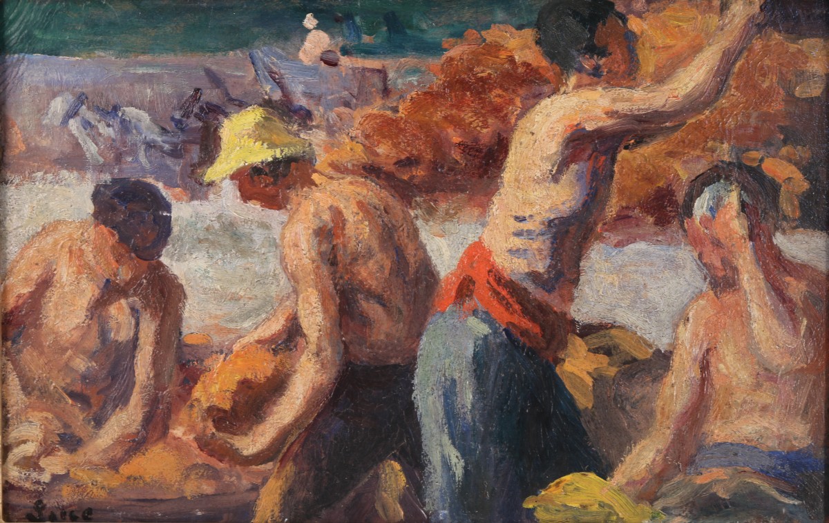 -Maximilien LUCE, Débardeurs sur les Quais de Seine, huile sur carton, Haut. 13, 5, Larg. 54 cm., collection Bessan (Bouin-Luce, Jean, Bazetoux, Denise, op. cit., p. 223).