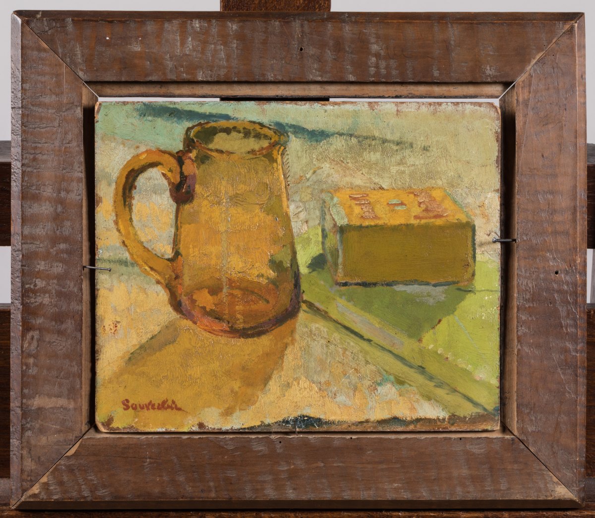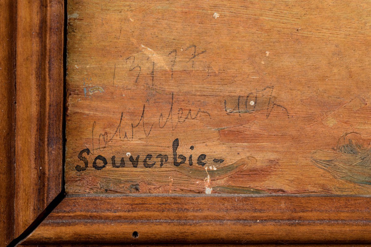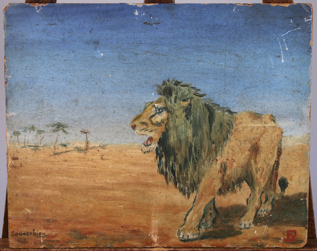 Au dos un Lion dans le désert signé en bas à gauche "Souverbie" avec un monogramme rouge en bas à droite.