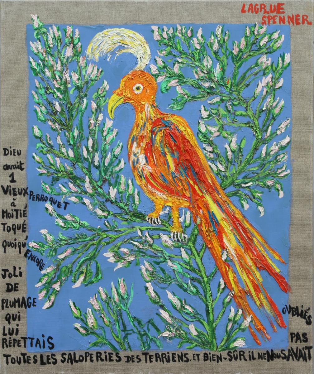 "Dieu avait 1 vieux perroquet à moitié toqué quoiqu'encore joli de plumage qui lui répettais toutes les saloperies des terriens. Et bien-sûr il ne nous avait pas oubliés".