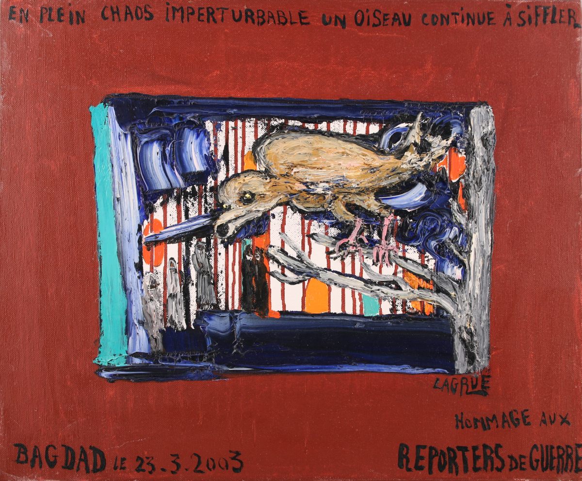 Toile signée en bas à droite, située Bagdad et datée 23-3-2003 en bas à gauche..