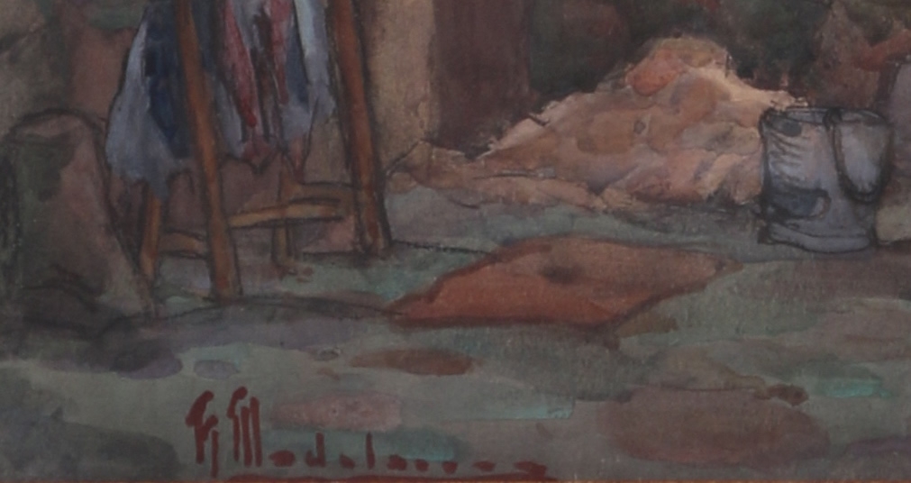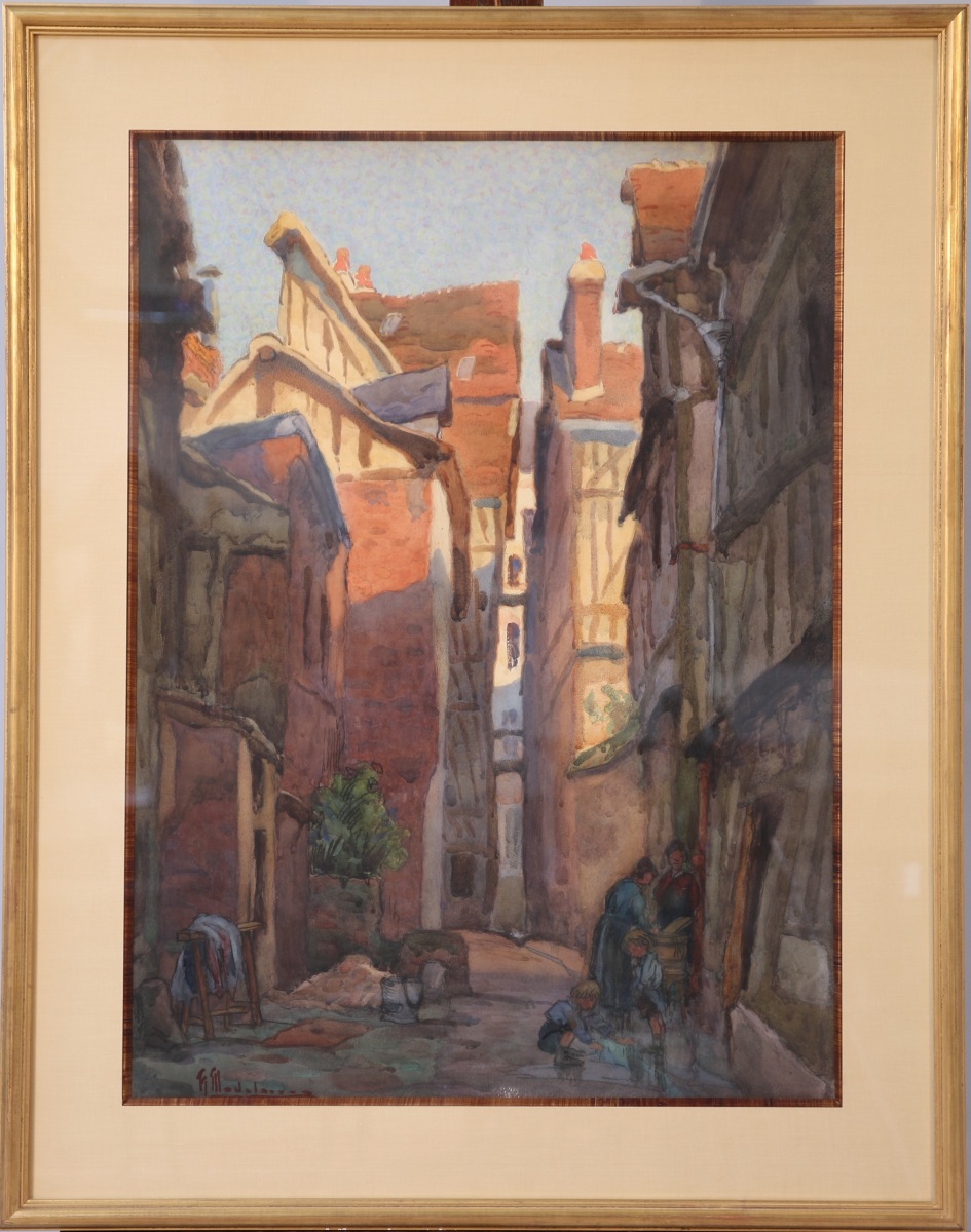 Hippolyte MADELAINE (1871-1966)Ruelle animée en Bourgogne (?). Aquarelle signée en...