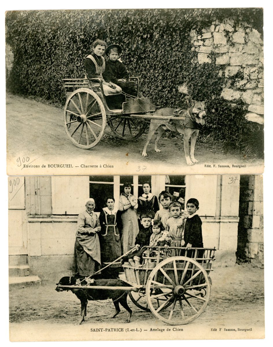 [INDRE ET LOIRE] env. 85 cartes postales anciennes et cpsm : villes, villages, animations, sites, églises et châteaux. Dont Saint Patrice attelage de chiens ; Environs de Bourgueil, charrette à chien.
