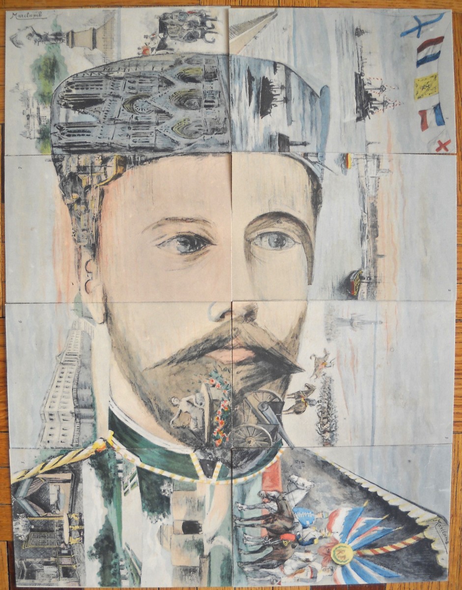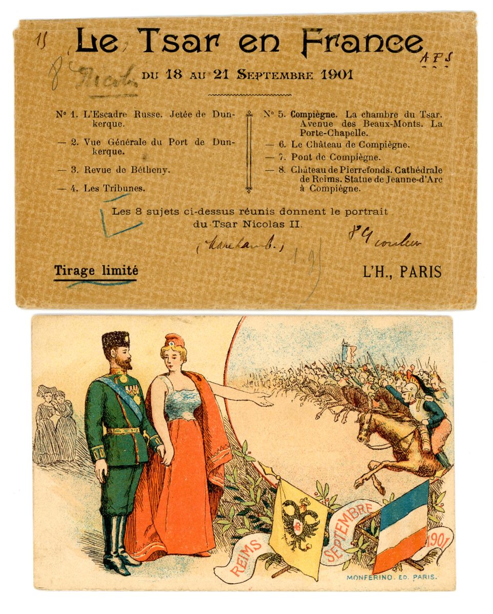 [RUSSIE] Série complète puzzle de 8 cp illustrées par Marc LAMB, représentant le Tsar Nicolas II, avec enveloppe pochette. Non écrites et non circulées. Editées à l'occasion de la visite en France du Tsar et de la Tsarine en septembre 1901. Colorées à la main. Ni écrites, ni voyagées. Bel état. Rare.