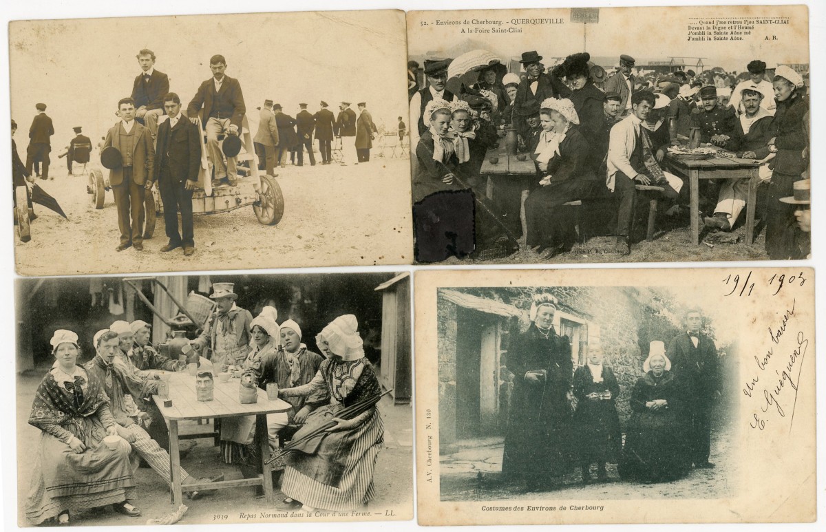 [NORMANDIE/ANJOU] env. 700 cartes postales anciennes et cpsm, dépts 14-27-49-50-53-61 et 76, principalement scènes et types [env. 255 cp] dont séries coiffes d'hier, et villes, qqs villages, ports, bateaux, plages, animations, châteaux, églises, etc.