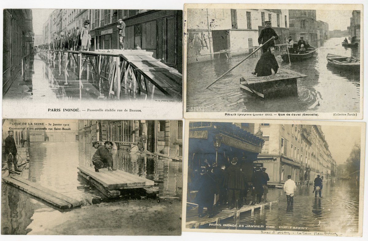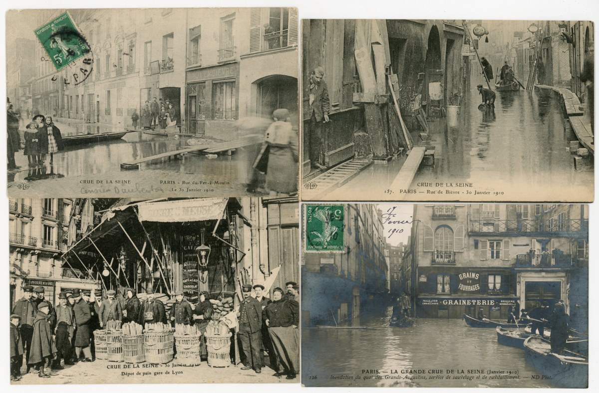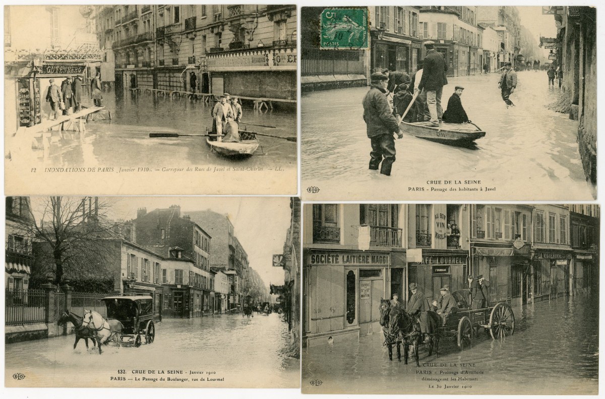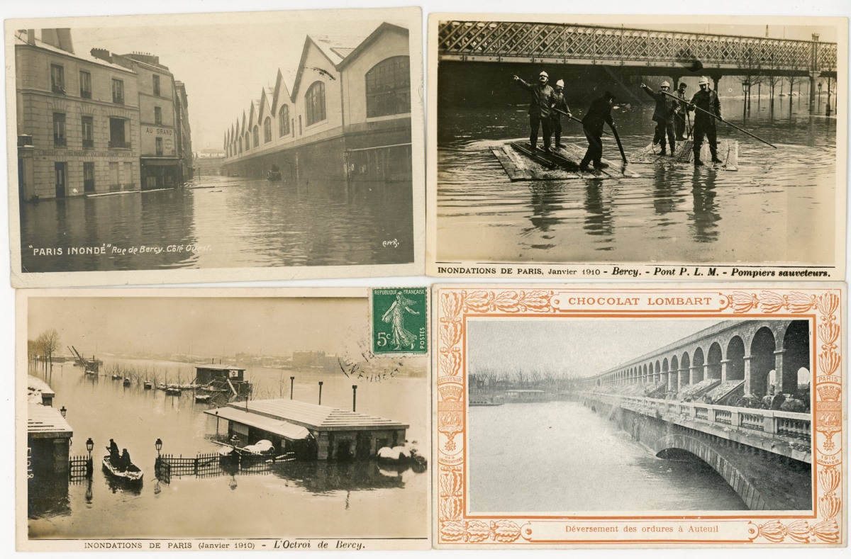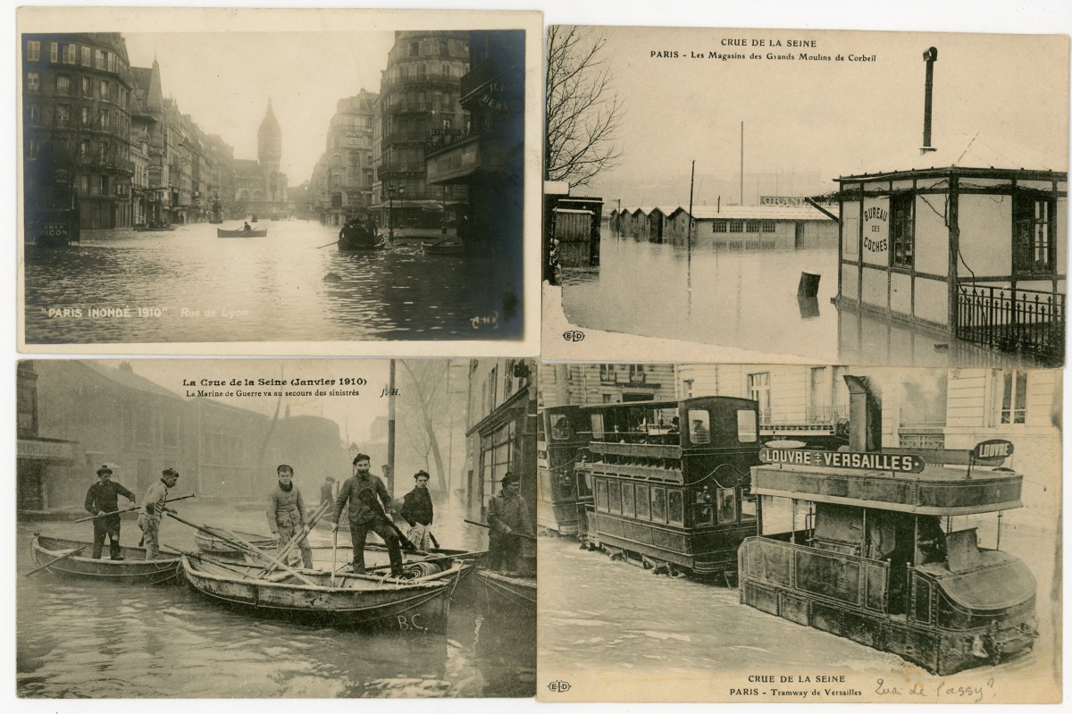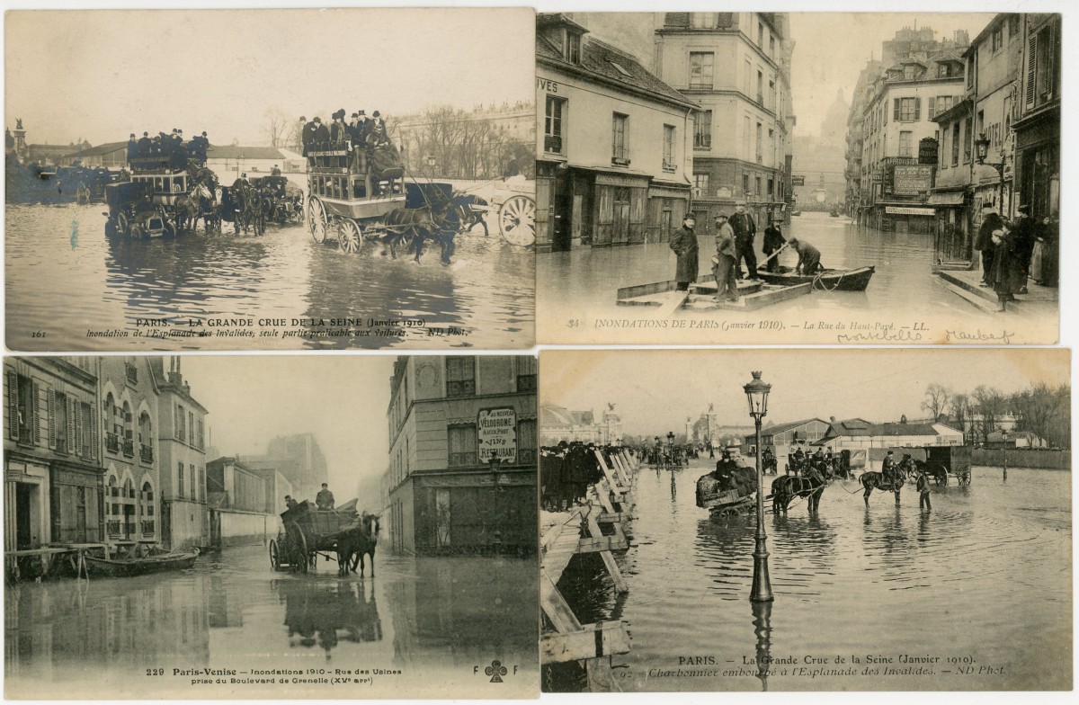 [PARIS] 287 cartes postales anciennes, inondations de 1910, rues, ponts, monuments de Paris inondés, animations, etc. Toutes différentes.