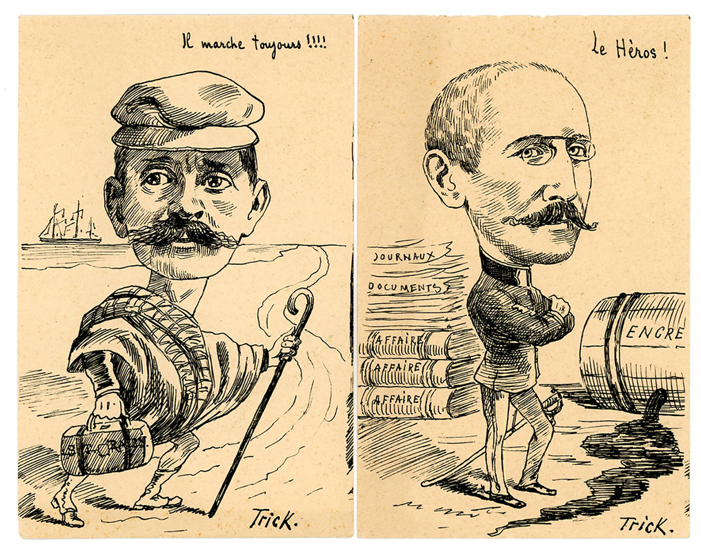 [DREYFUS - ILLUSTRATEUR] Série complète de 6 cartes postales illustrées par TRICK, non circulées et non écrites, en bon état, avec l'enveloppe pochette titrée : " Affaire Dreyfus, ses principaux acteurs ". Rare ensemble.