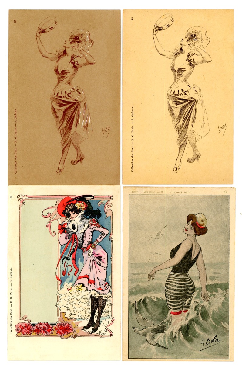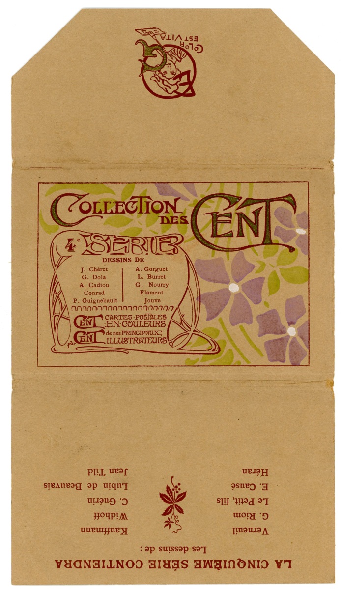 [COLLECTION DES CENT - ILLUSTRATEURS] Suite complète de 10 cp en couleurs de la 4e série de la " Collection des Cent ", non circulées et non écrites, bon état, avec enveloppe pochette ; Jules Chéret avec rehauts aquarellés, Dola (dos recollé ?), Cadiou, Conrad, Guignebault (dos recollé ?), Gorguet, Burret, Gaston Noury, Flament et Jouve.