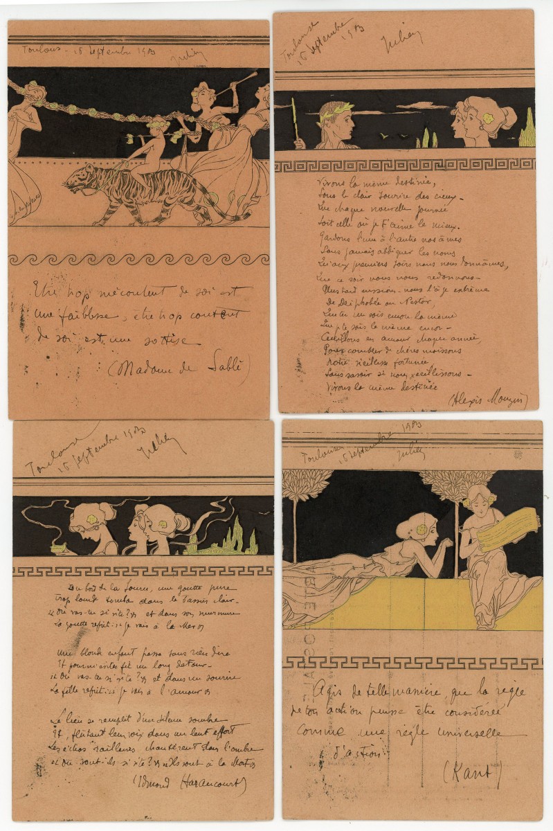 [ILLUSTRATEUR] 14 cartes postales illustrées par Raphaël KIRCHNER. Non signées. Séries incomplètes et cartes isolées. 1 double, en majorité écrites et voyagées, états divers : Scènes antiques en Grèce [4 cp] - Akropolis [2 cp] - ufs de Pâques [3 cp dont double] - Portrait à l'antique - Femme à la Harpe, Rose fond bistre - Femme, fond bistre - Femme au manchon sur fond turquoise.