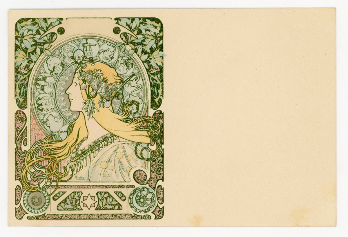 [ILLUSTRATEUR] 2 cartes postales artistiques illustrées par Alfons MUCHA, 2ème série, c. 1900 : Rêverie et Zodiaque. Ni écrites, ni voyagées. Légères tâches. Très bel état.