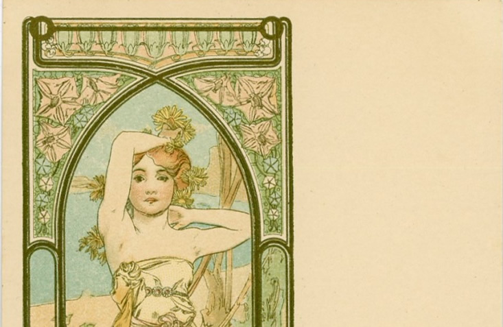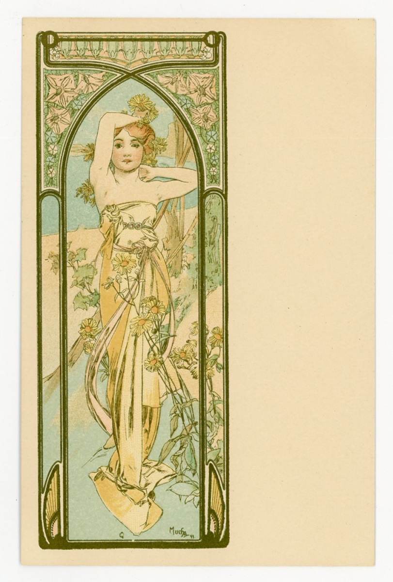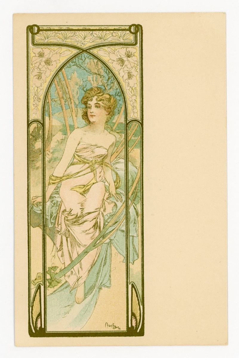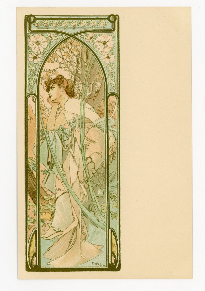 [ILLUSTRATEUR] Suite complète de 4 cartes postales artistiques illustrées par Alfons MUCHA, " Les Heures du Jour ", 6ème série, c. 1901 : L'Éclat du Jour, Repos de la Nuit, Rêverie du Soir, Éveil du Matin. Ni écrites, ni voyagées. Légers défauts en coin. Très bel état.