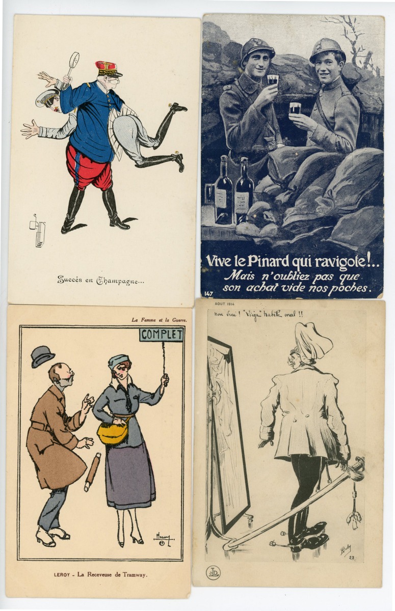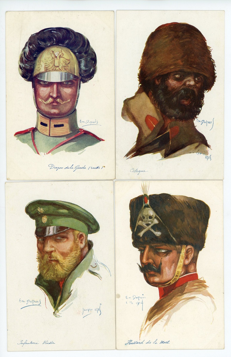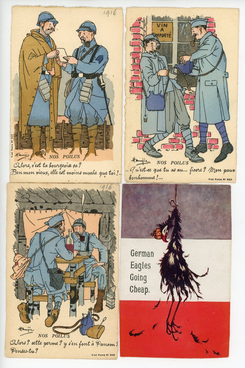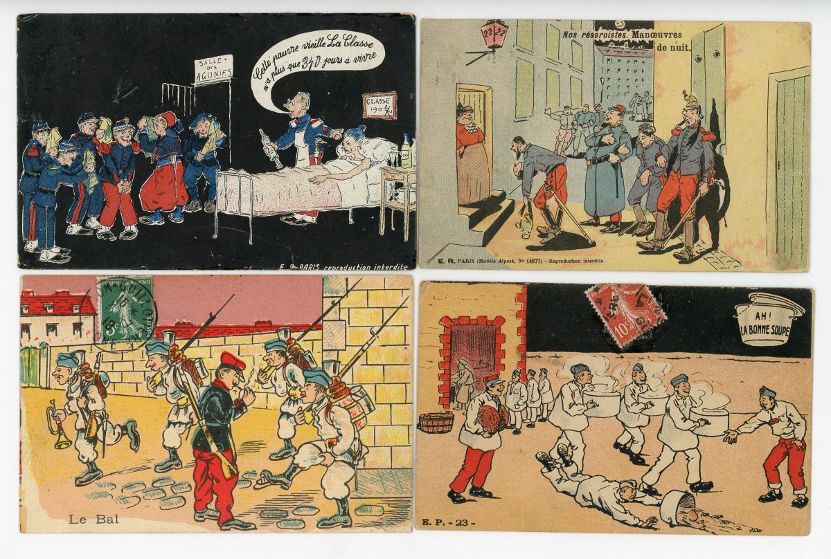 [MILITARIA] env. 395 cartes postales anciennes et qqs cpsm, Militaria et Guerre 14-18 : satiriques et patriotiques, illustrateurs et illustrations dont : Em Dupuis [49 cp], André Soriac [14 cp dont 2 écrites et signées par Soriac], Edy [10 cp], A. Bertiglia [9 cp], F. Chamouin [8 cp], B. de Guinbald [8 cp], Hemjic [6 cp], Arthur Foache [4 cp], C. Maréchaux [4 cp], Bergère [4 cp], Willette, Manfredini, Falké, Moriss, Paracini [4 cp], etc.
