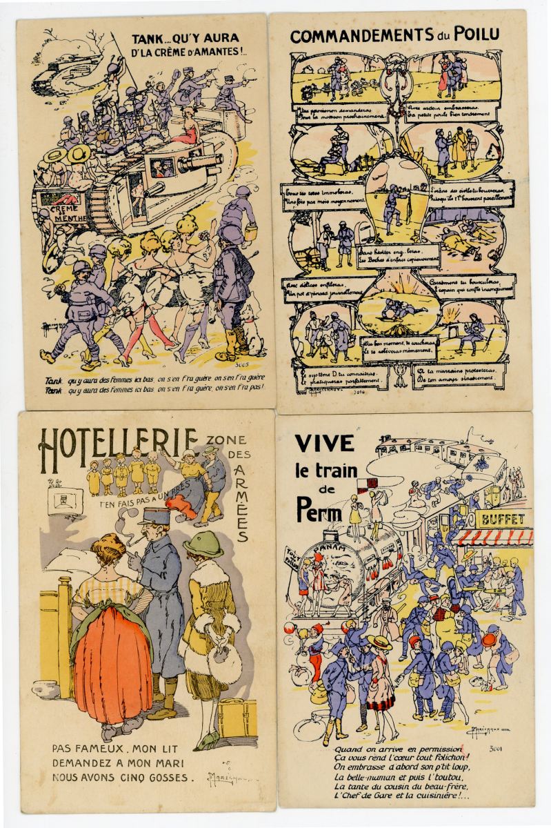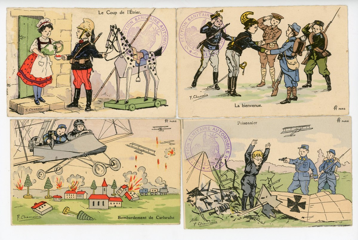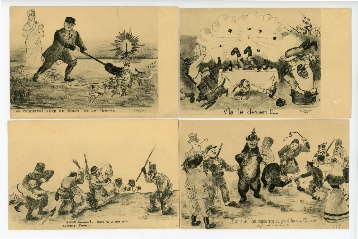 [MILITARIA] env. 395 cartes postales anciennes et qqs cpsm, Militaria et Guerre 14-18 : satiriques et patriotiques, illustrateurs et illustrations dont : Em Dupuis [49 cp], André Soriac [14 cp dont 2 écrites et signées par Soriac], Edy [10 cp], A. Bertiglia [9 cp], F. Chamouin [8 cp], B. de Guinbald [8 cp], Hemjic [6 cp], Arthur Foache [4 cp], C. Maréchaux [4 cp], Bergère [4 cp], Willette, Manfredini, Falké, Moriss, Paracini [4 cp], etc.