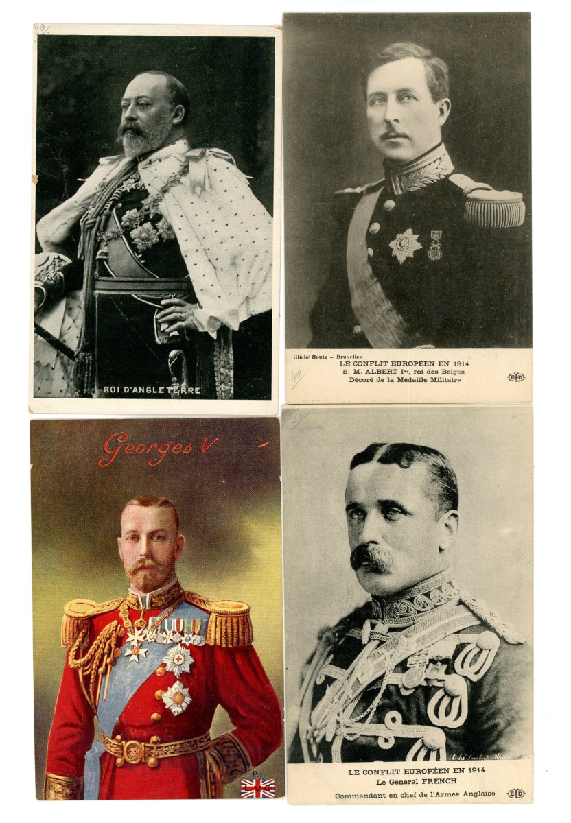[POLITIQUES] 98 cartes postales anciennes et cpsm, non circulées et ni écrites, personnalités politiques, de la royauté et religieux, dont série complète de 10 cp illustrées par THUG, avec enveloppe pochette titrée : " Le dessus du panier, Dieux déchus " ; en majorité portraits gravés.
