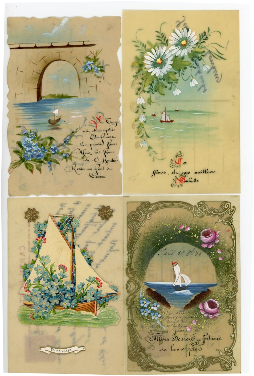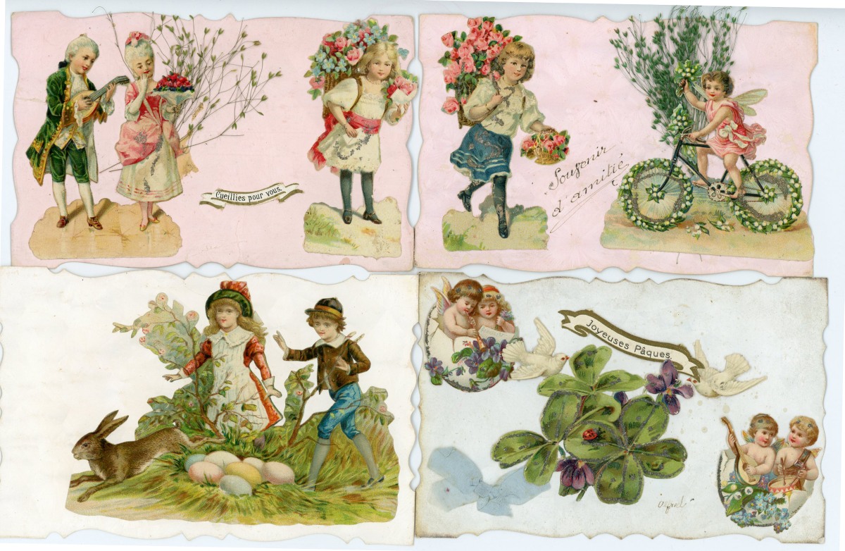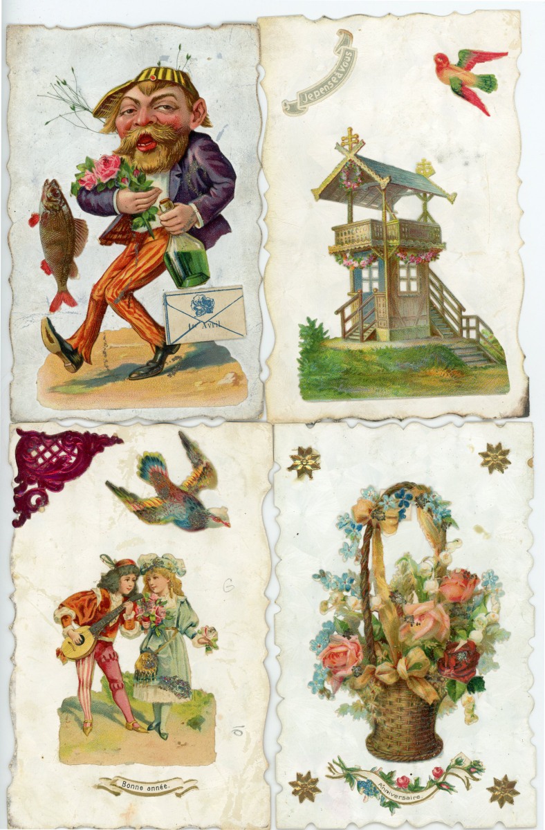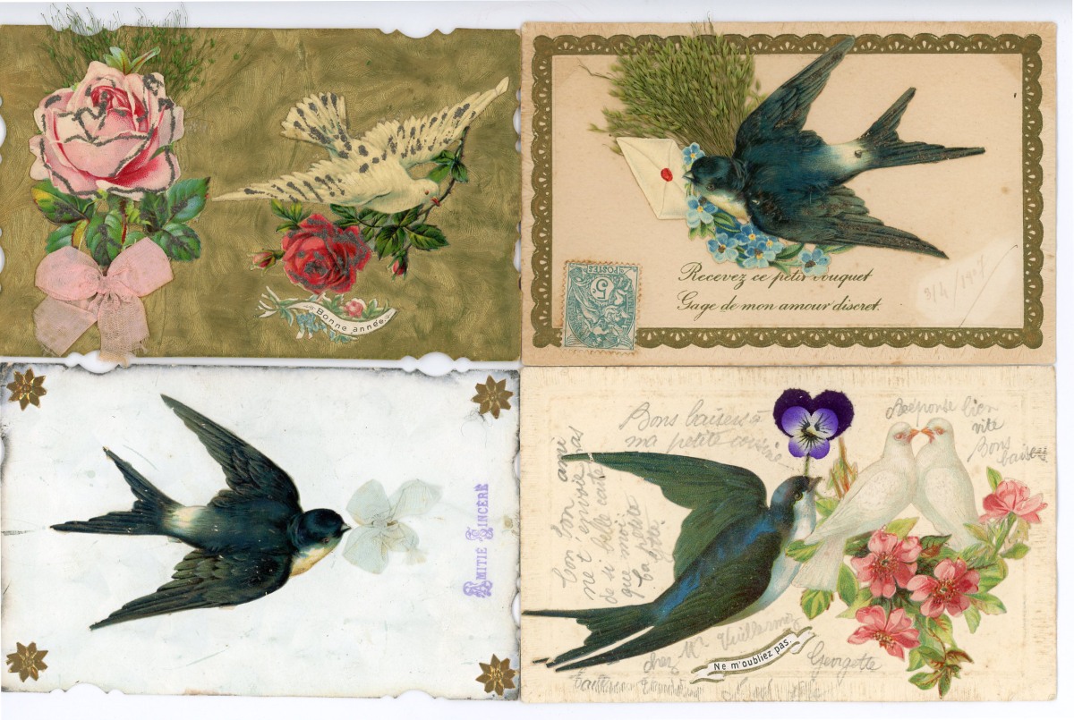 [FANTAISIES] Lot de + de 255 cartes postales fantaisies : papier, dentelles, celluloïds, bois, tissus, ajoutis, découpis, chromos, peintes, bords travaillés, gaufrées. Thèmes divers (fleurs, poissons, bateaux, enfants, anges, oiseaux, etc).