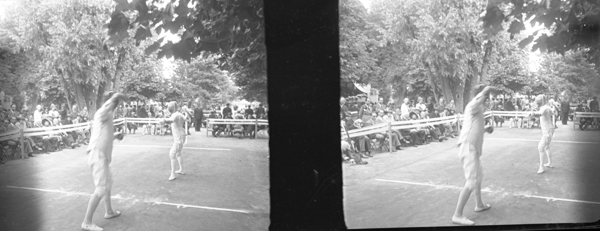 [Europe - Escrime] Env. 495 plaques de verre stéréoscopiques prises par Jacques COUTROT, positives et négatives, 12 x 9 cm, certaines légendées. Qqs accdts.