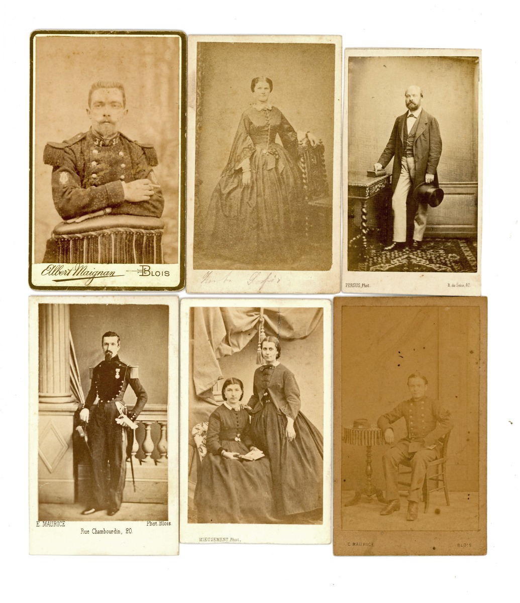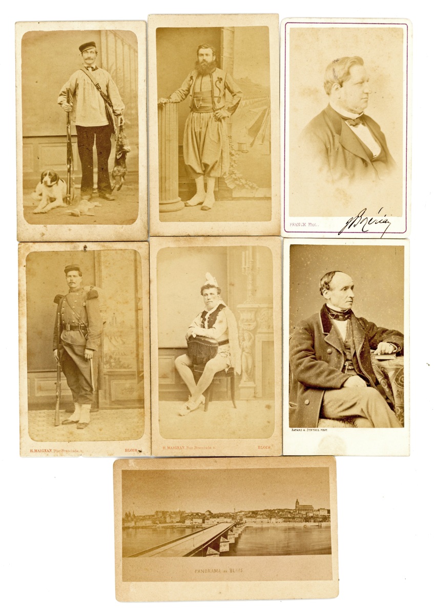 [LOIR-et-CHER] 18 tirages photographiques format carte de visite, du Second Empire à la Belle-Epoque, dont portrait de Jules François Jeannotte-Bozérian (1825-1893), conseiller général et député Victor Reber, professeur d'histoire au collège de Blois de 1848 à 1870 - M. Vidal, proviseur du collège de Blois de 1851 à 1856 - M. Boullaud, professeur au collège de Blois de 1848 à 1878 - Zouave pontifical par H. Maignan à Blois - Garde chasse par H. Maignan à Blois - Comédien par H. Maignan à Blois - 2 clichés par Mieusement - Officier du génie avant 1870 - Musicien du 31e régiment - etc.