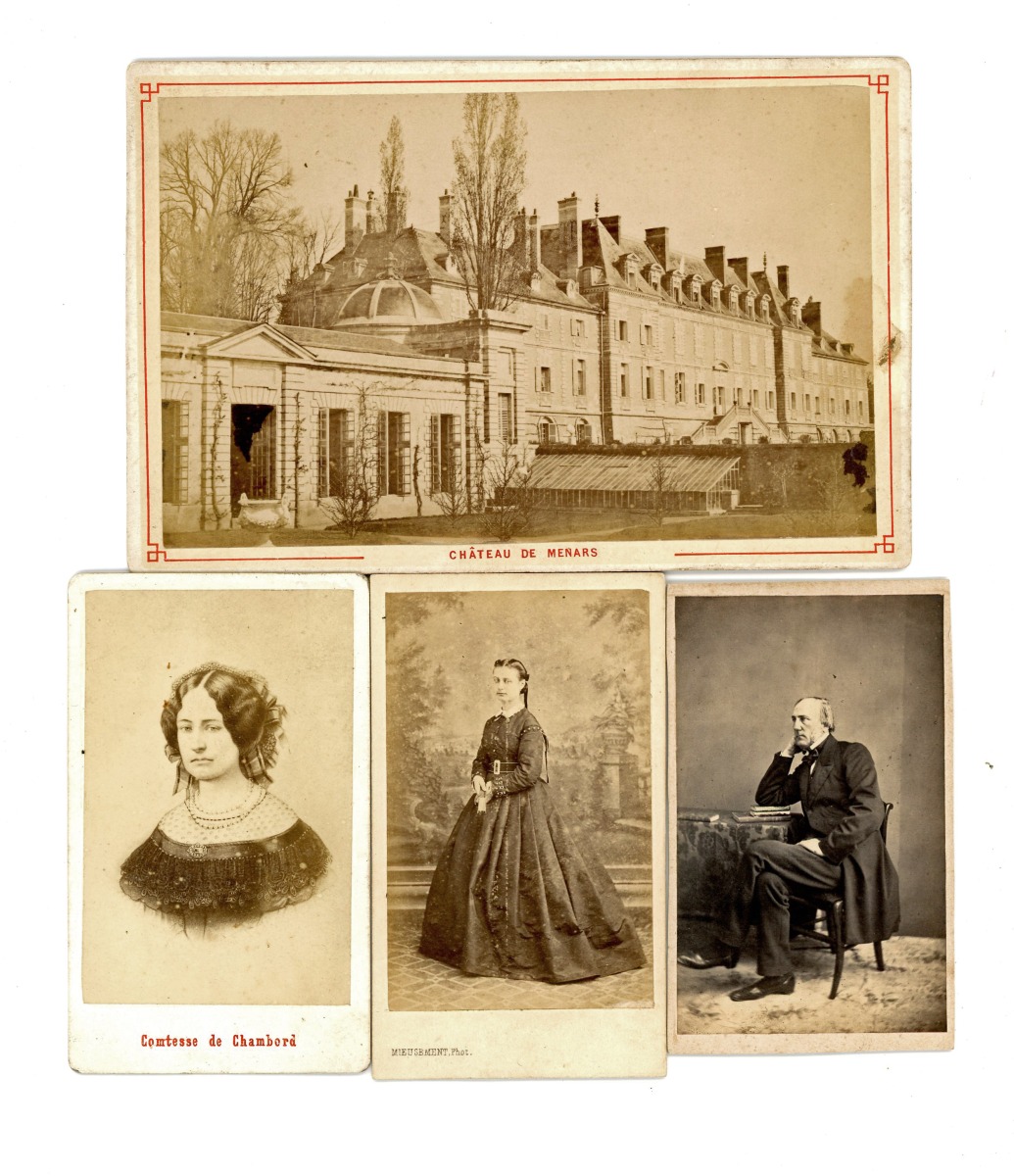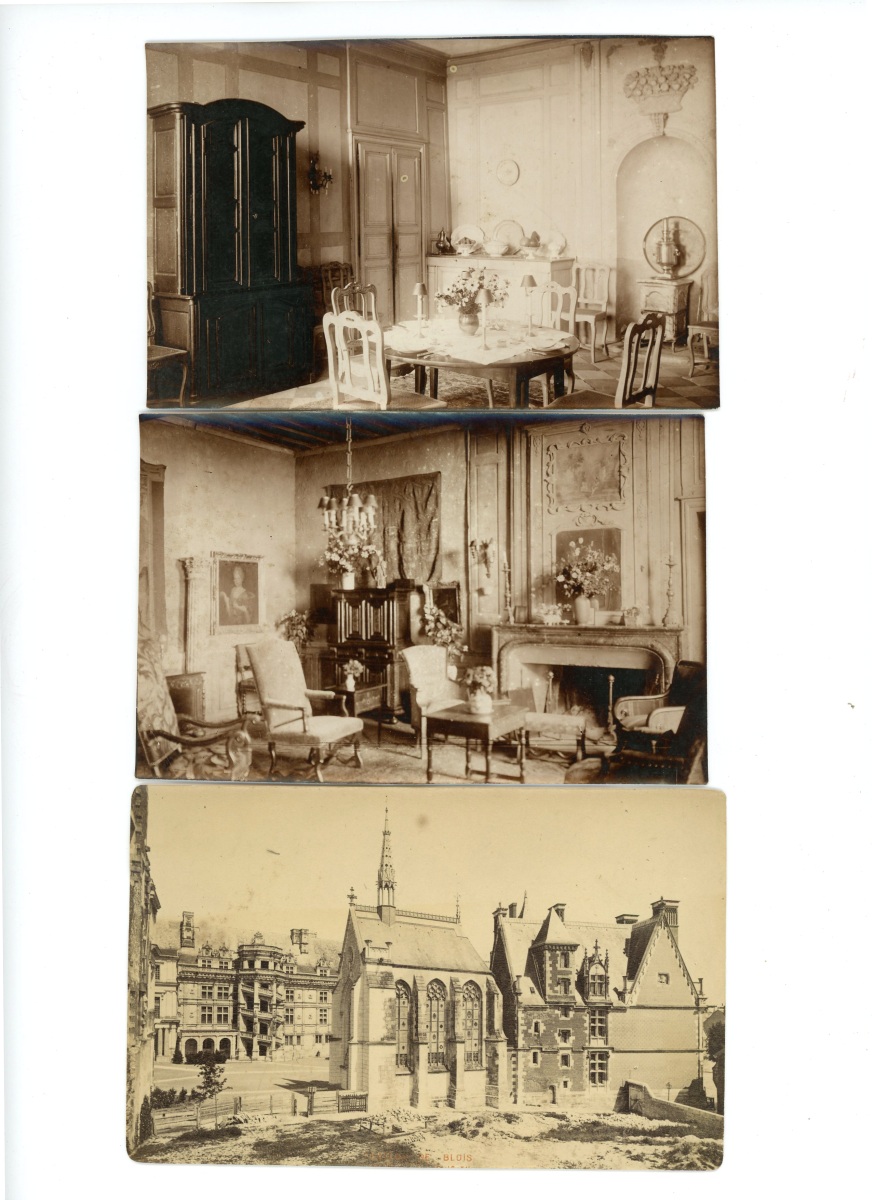 Joint : 2 tirages photographiques, vues intérieures du château de Talcy, 9 x 14 cm, avant 1914 - Château de Ménars, 9 x 15 cm - 3 vues de Blois.