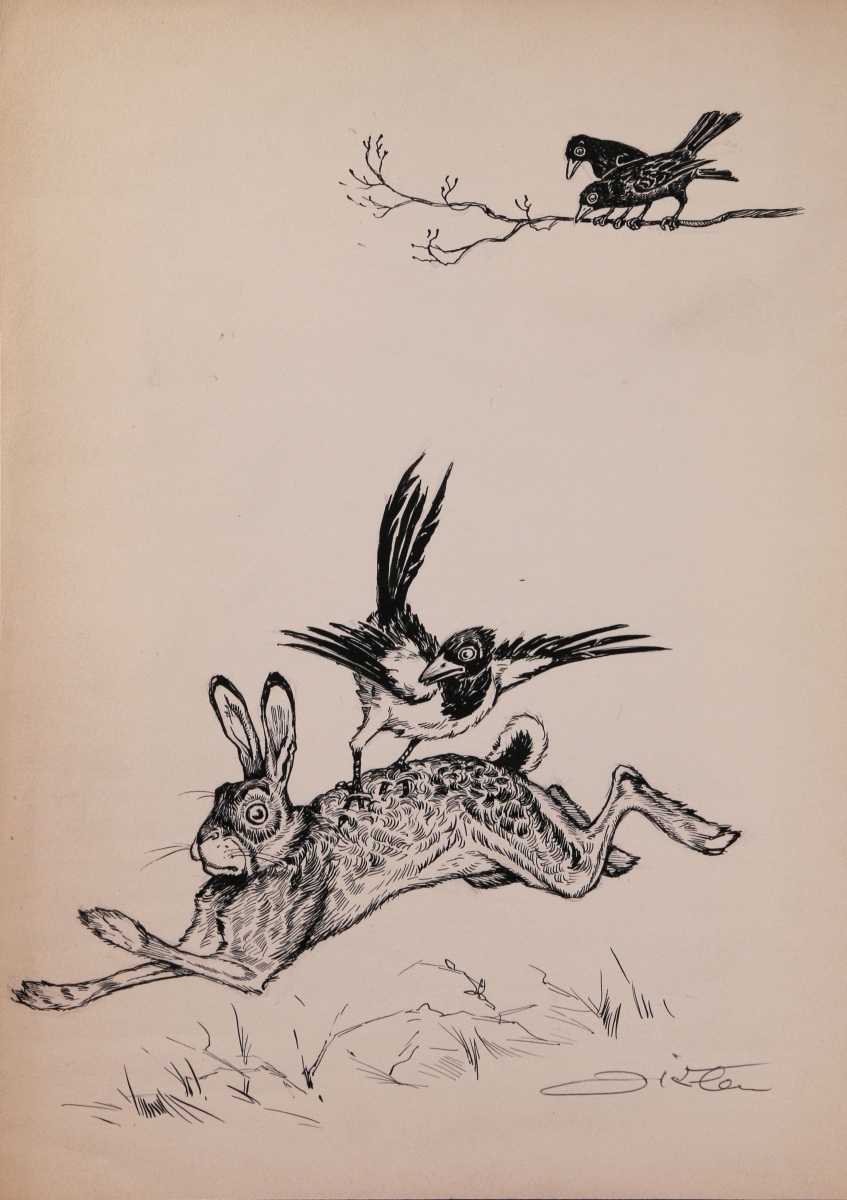 - École du XXe. Pie perchée sur un lièvre. Encre signée en bas à droite. Haut. 30,5, Larg. 21,5 cm.