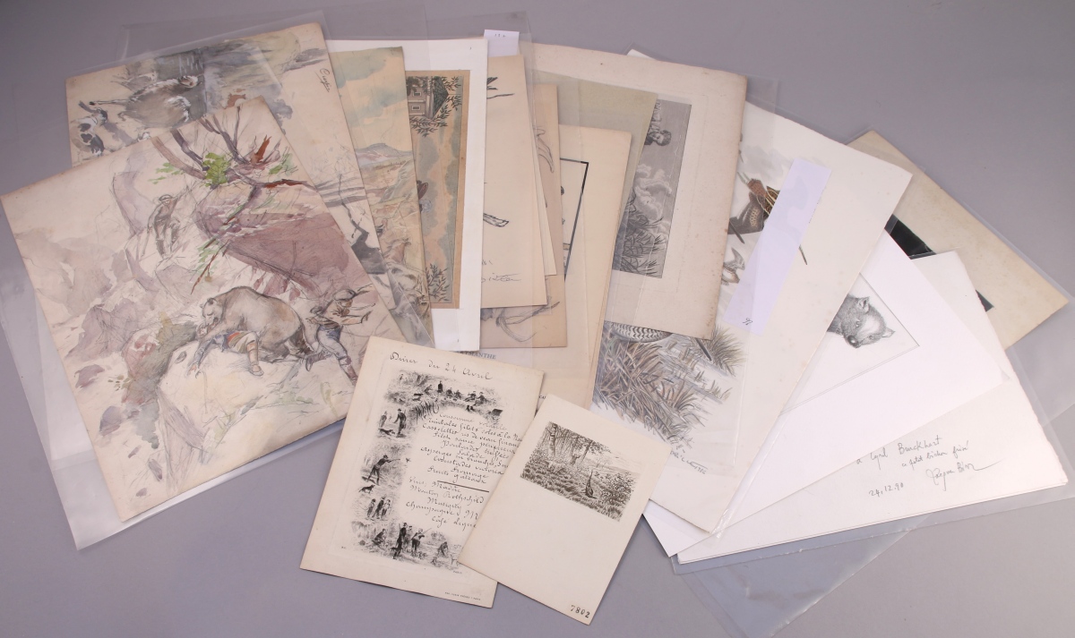 - École fin XIXe-début XXe. trois aquarelles gouachées. Chasseur attaqué par un ours; Chasse au lama et Éboulement sur un troupeau . Haut. 37, Larg. 26,5 cm.