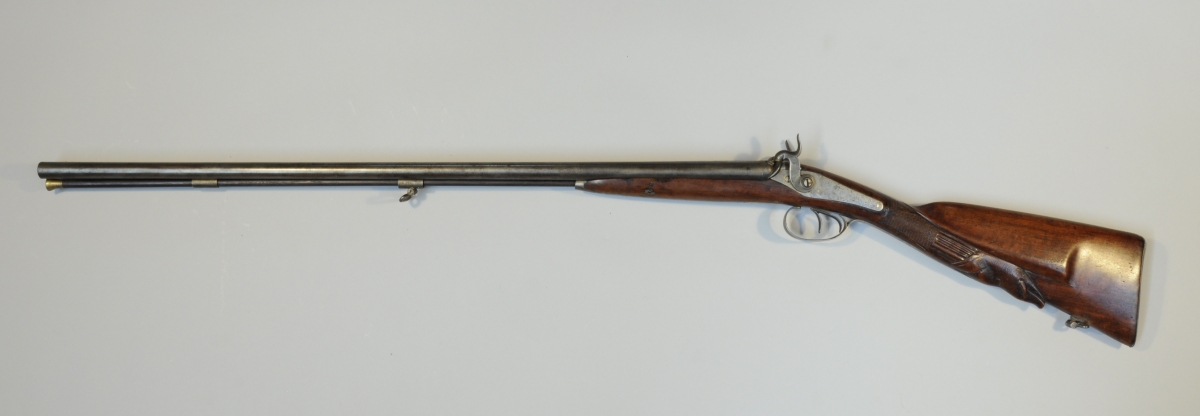 FUSIL DE CHASSE à percussion, deux coups à canons en table. Crosse en noyer sculptée d'une hure de sanglier.