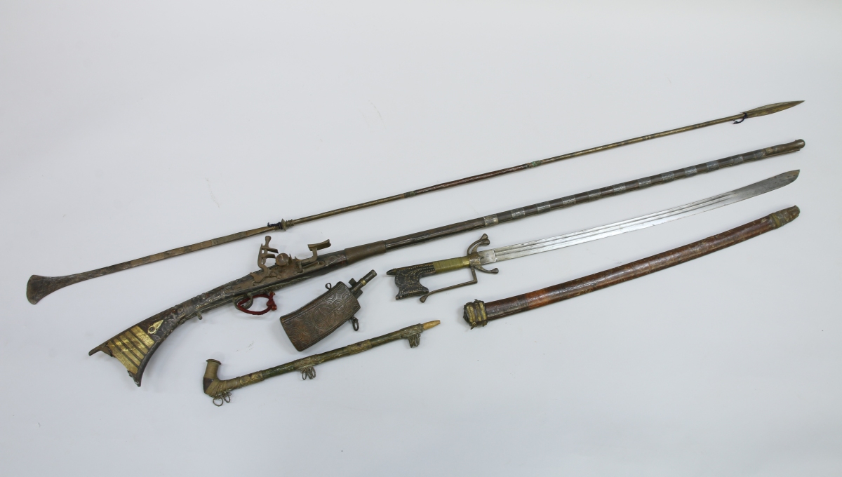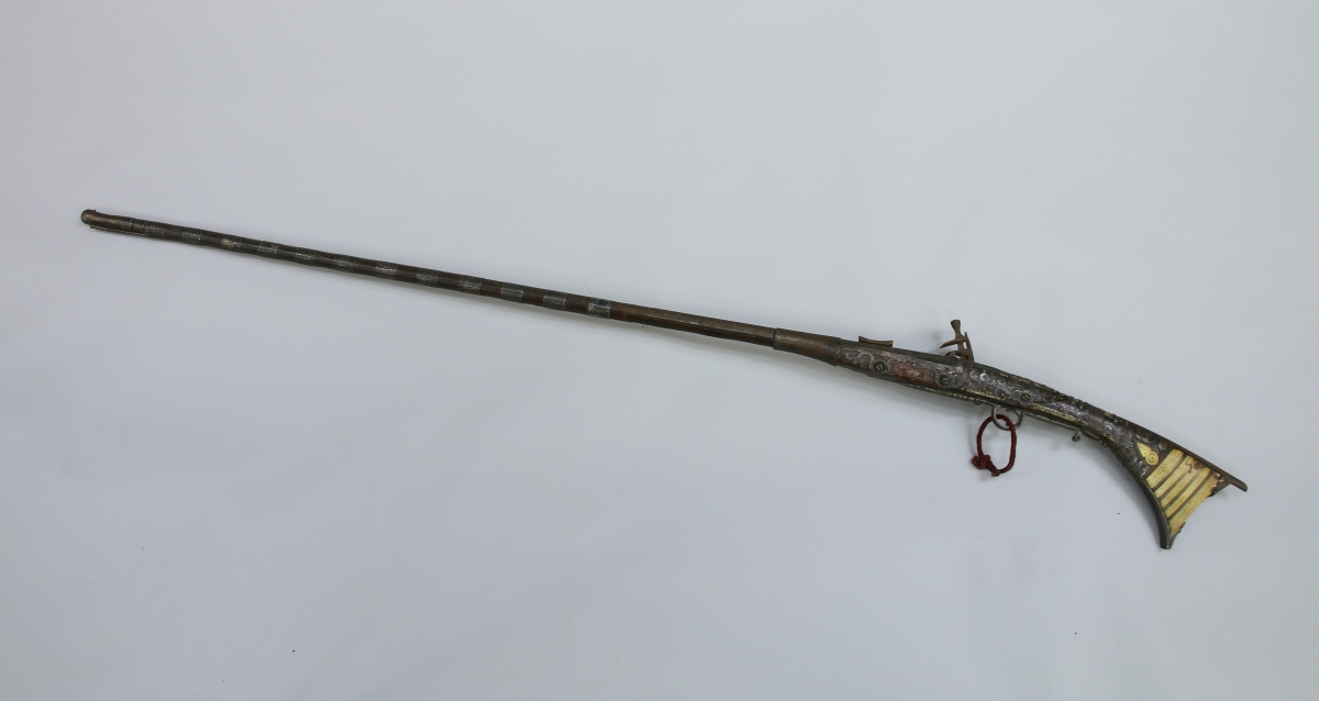 - FUSIL dit MUKHALA, à silex. Crosse en bois, à talon en plaquettes d'os, richement appliquée de garnitures de fer ajourées de rinceaux, incrustée de pastilles d'os, gravée et peinte de filets et enroulements rouges. Canon fixé au fût par 14 bagues. Long. 166 cm.
