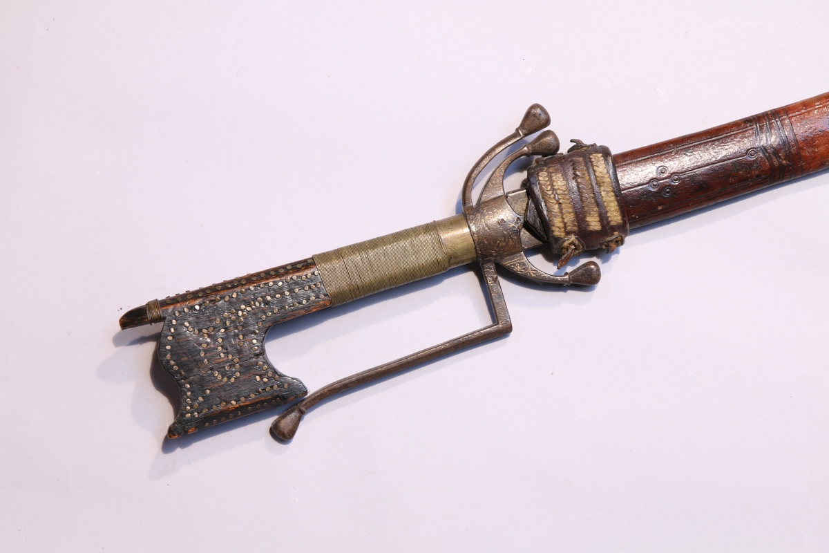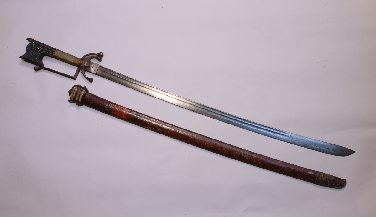 - NIMCHA, poignée en bois laquée noir cloutée et filigranée de laiton. Garde en fer incrusté de rinceaux or (usures) à triple quillon et une branche. Lame légèrement courbe à double gouttière et contre-tranchant poinçonnée au talon. Fourreau en cuir.