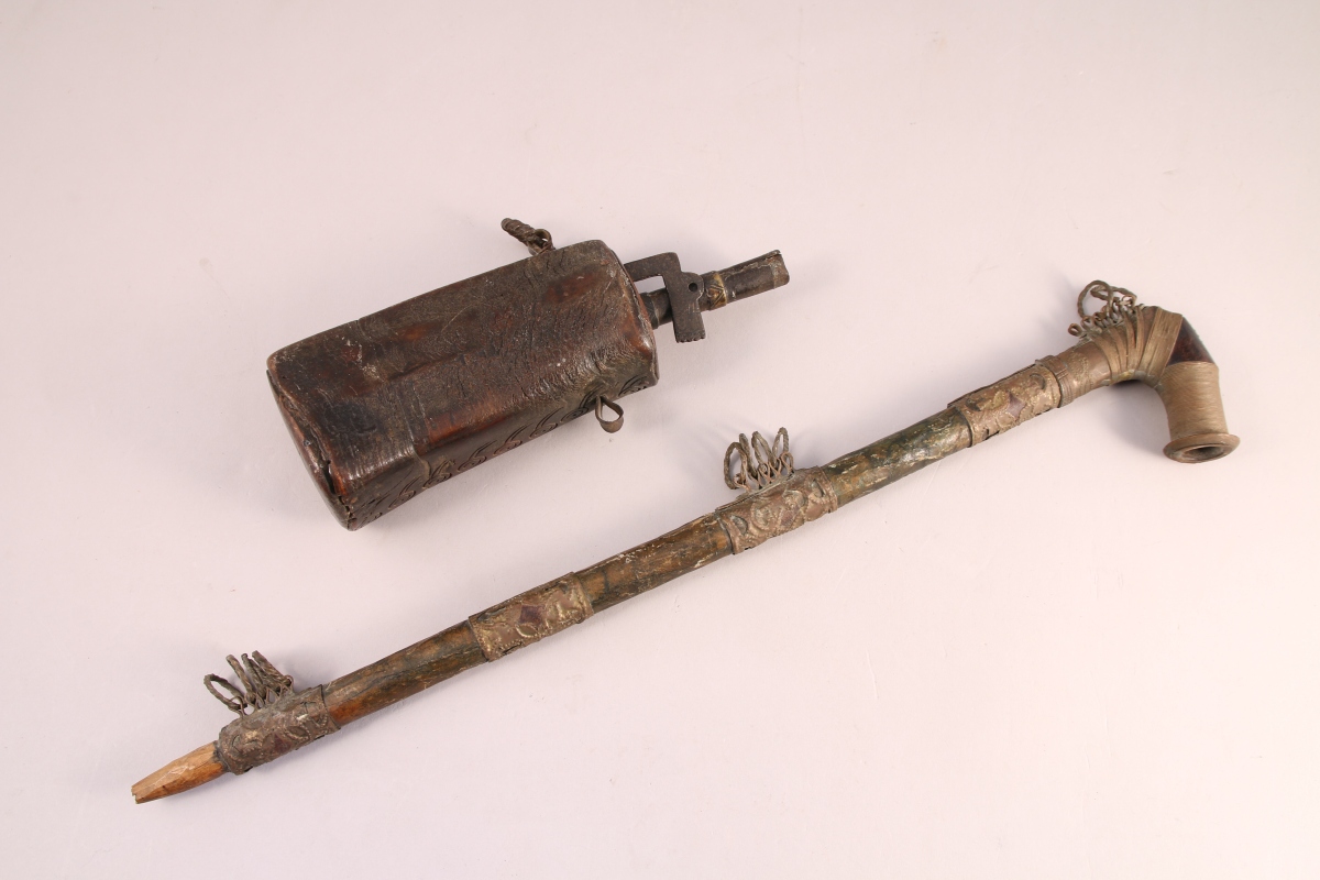 - PIPE à fourneau en métal et bois et tuyau en bois recouvert d'une feuille de papier. Garnitures et filigrane de laiton ajouré agrémentées d'anneaux mobiles.