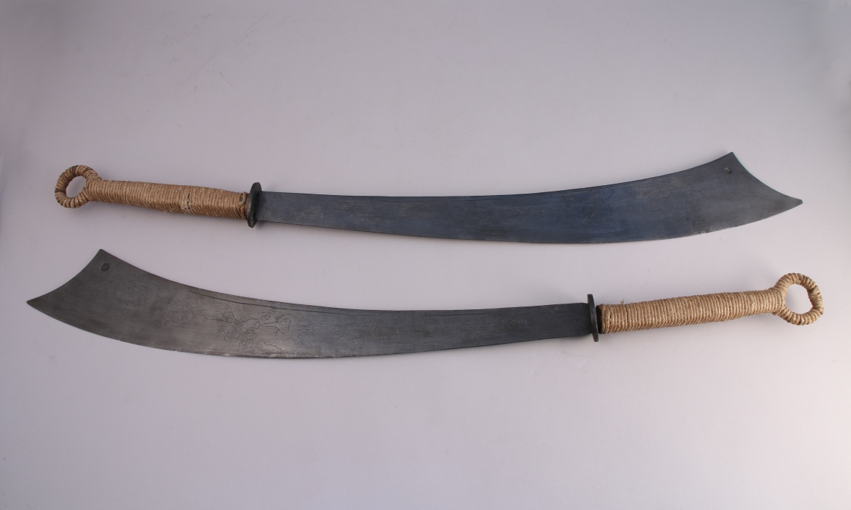 PAIRE D'ÉPÉES dites CIMETERRES. Lame à dos plat à décor gravé de phoenix, dragons et idéogrammes. Poignée recouverte de cordelette tressée.