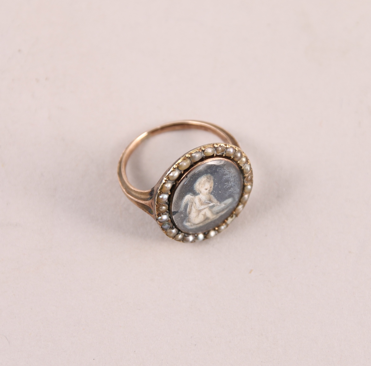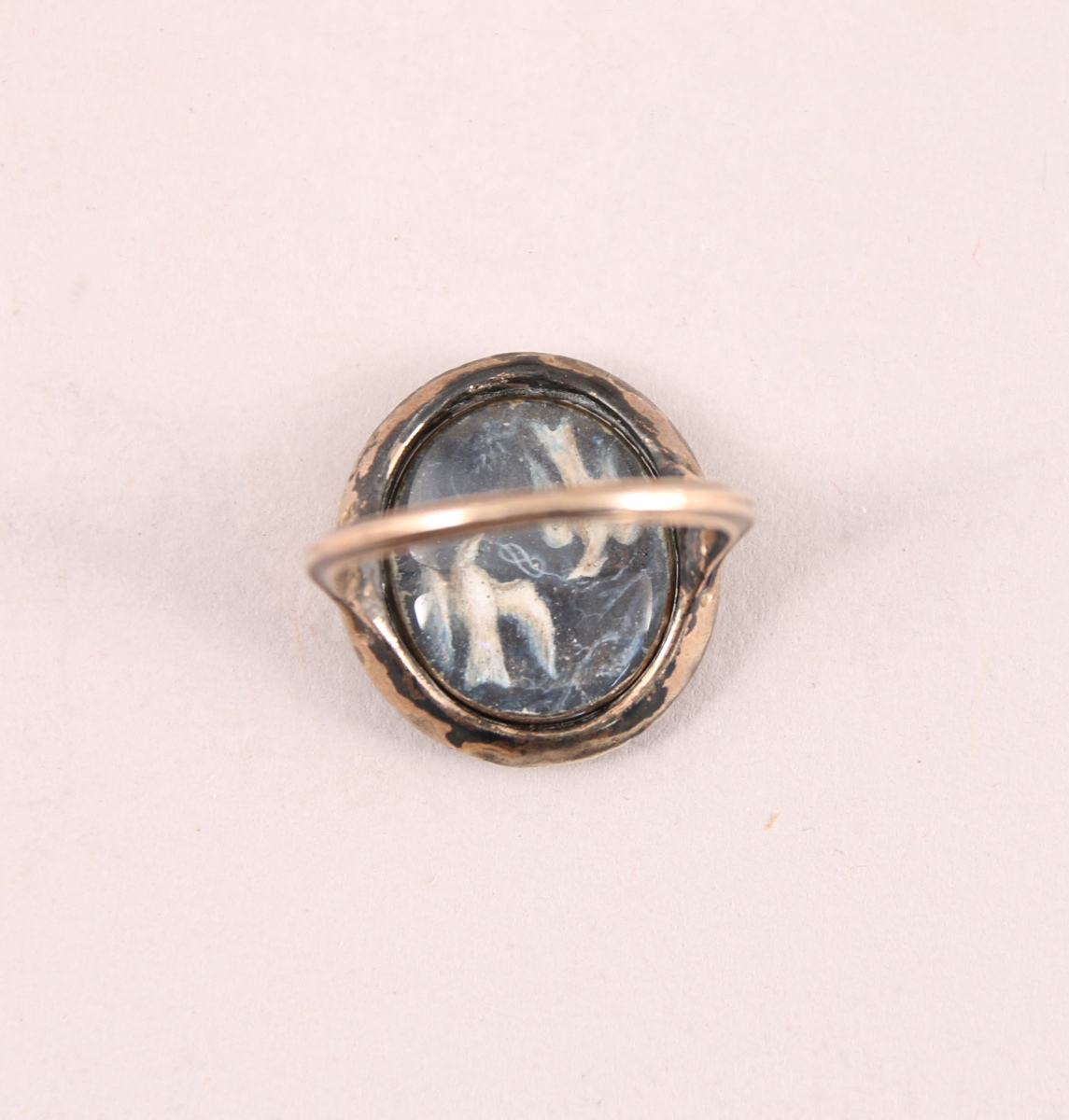 - BAGUE en cuivre, la lunette cerclées de perles. Le chaton pivotant orné d'une part d'un amour graveur et d'autre part de deux colombes.