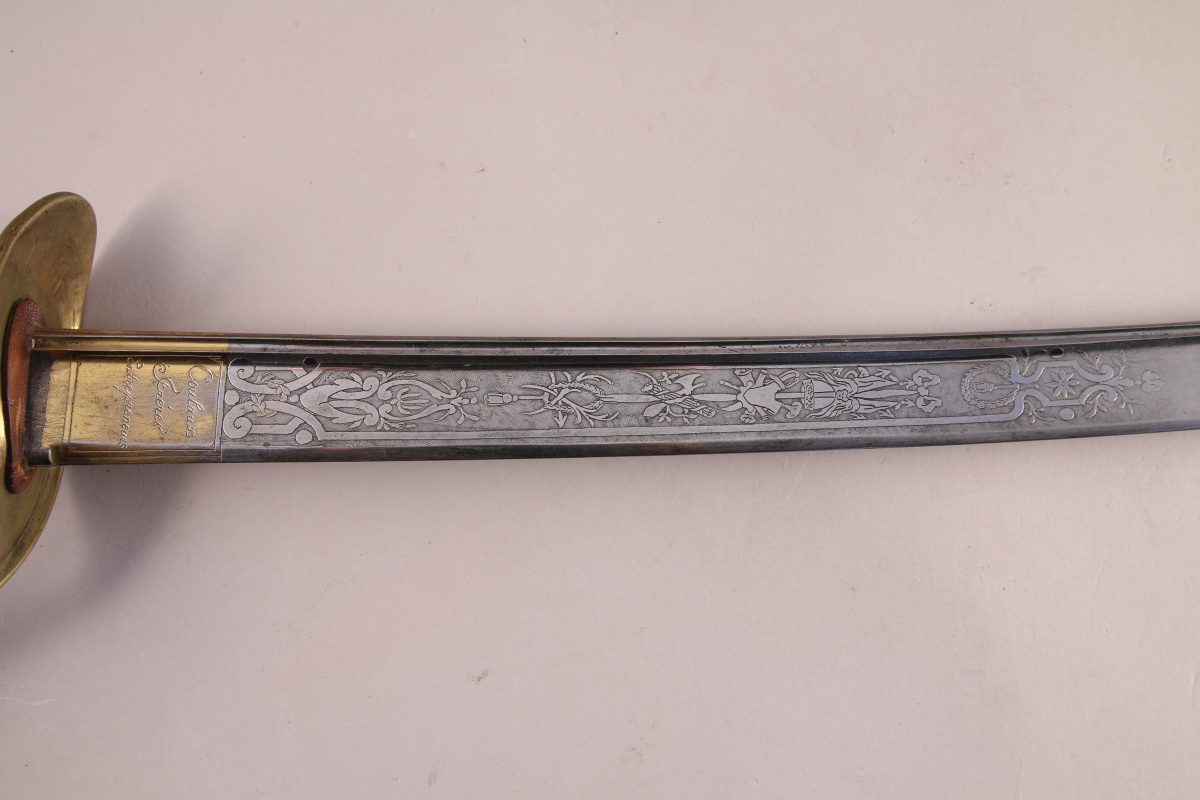 Lame courbe damas avec une gravure apocryphe aux faisceaux de licteurs et de la dédicace. Signée de la " Manufacture Nationale d'armes Blanches de Klingenthal " et de " Coulaux Frerès Entrepreneurs ".