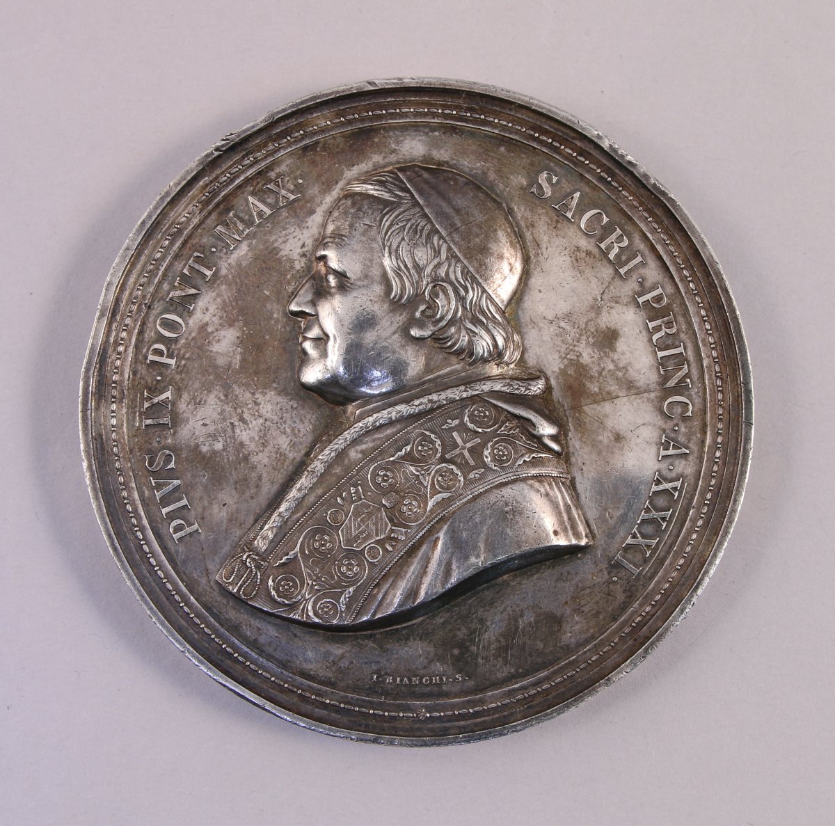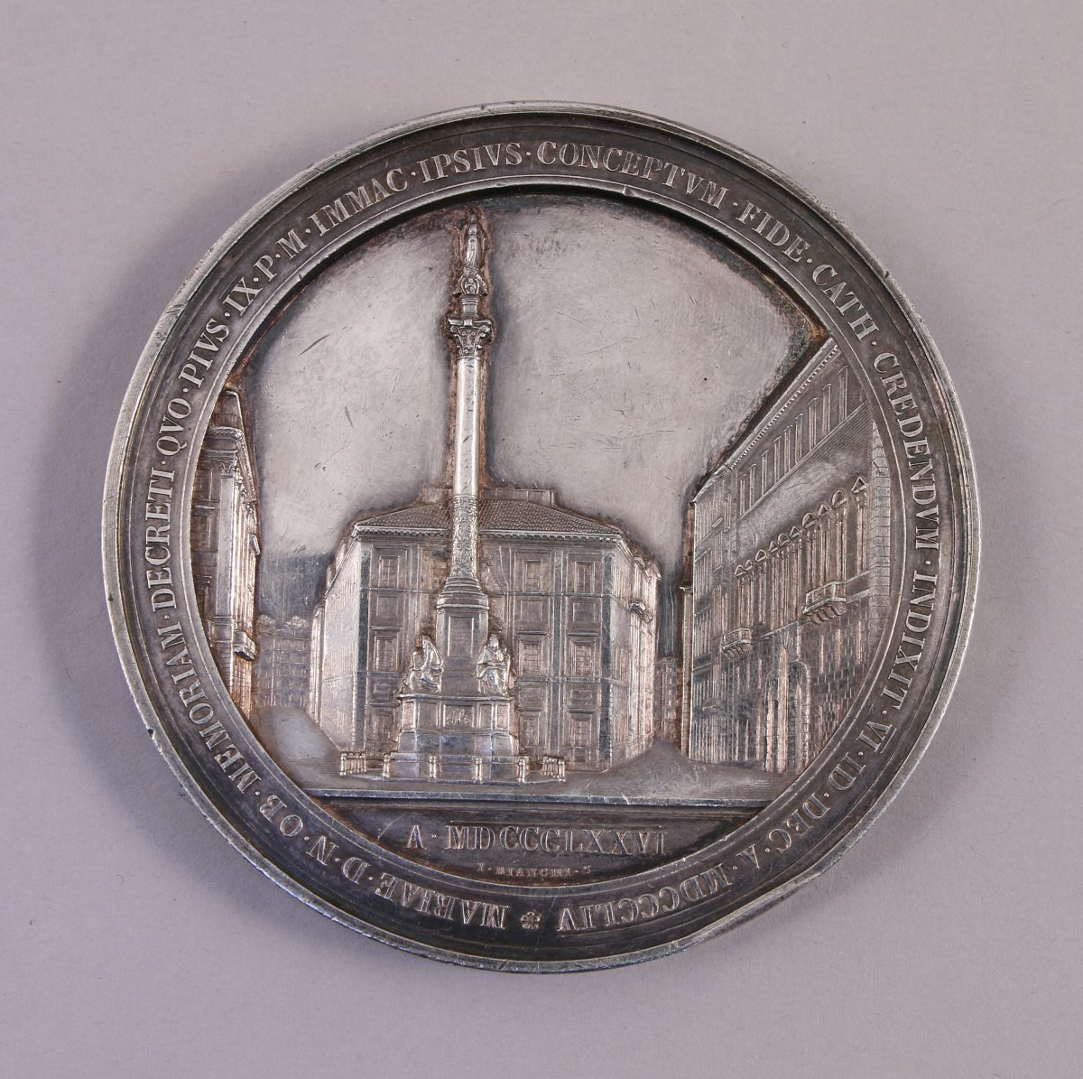 SAINT-SIÈGE - Grande MÉDAILLE commémorative du monument à la Vierge de la Place d'Espagne à Rome, 1876, par Guiseppe Bianchi, en argent, à l'avers le pape Pie IX de profil à gauche ceint de la légende "PIUS IX PONT. MAX. SACRI. PRINC. A. XXXI", au revers une scène architecturée figurant, devant l'ambassade d'Espagne et le palais de la Propagande de la Foi, la colonne érigée en 1857 en l'honneur de la Vierge, ceinte d'une légende rappelant la promulgation du dogme de l'Immaculée Conception le 8 décembre 1854.