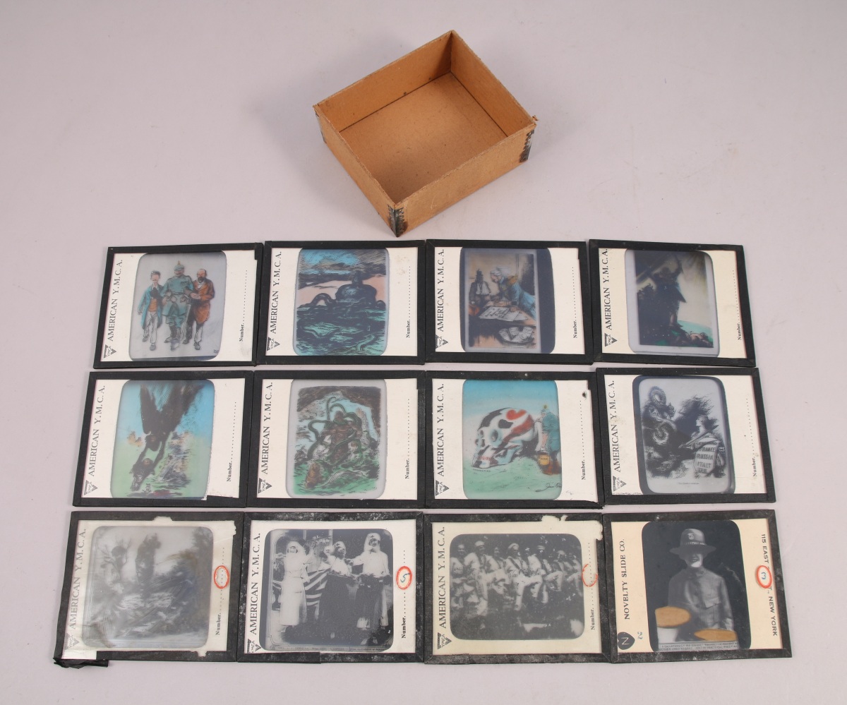 GRANDE GUERRE. 12 PLAQUES de VERRE éditées par la YMCA (Young Men's Christian Association) durant la Première Guerre Mondiale. Huit figurent des caricatures hostiles à la Prusse et quatre des photographies de la vie quotidienne au front.