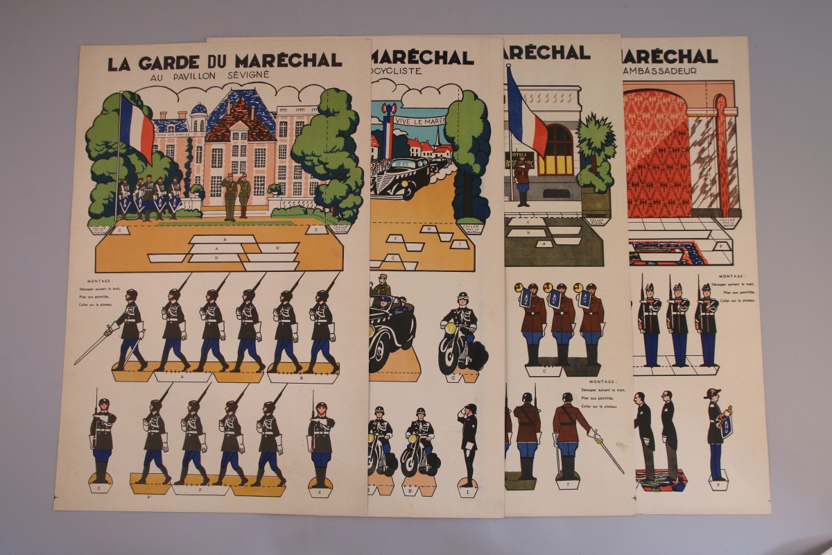 - "La Garde du Maréchal", suite de quatre planches en couleurs pour enfants présentant des silhouettes à découper et à coller sur un plateau; "Principes de la Communauté, une grande et trois petites affiches; "Connaissez-vous mieux que lui les problèmes de l'heure ?", affiche; Êtes-vous plus français que lui ?", affiche; "Je tiens les promesse même celles des autres", deux affiches; etc.