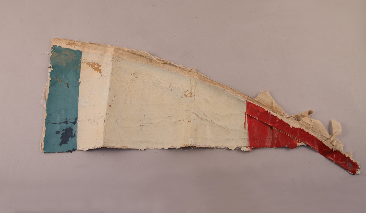 SOUVENIR DU DERNIER VOL DU GÉNÉRAL LECLERC. Selon un annotation manuscrite : "Morceau de toile recouvrant l'empennage de l'avion du général Leclerc. Accidenté dans les environs de Colomb-Béchar". Fragment de forme rectangulaire en toile laquée bleu blanc rouge.