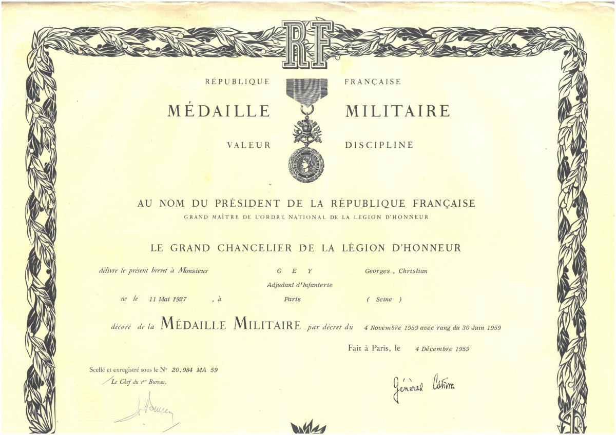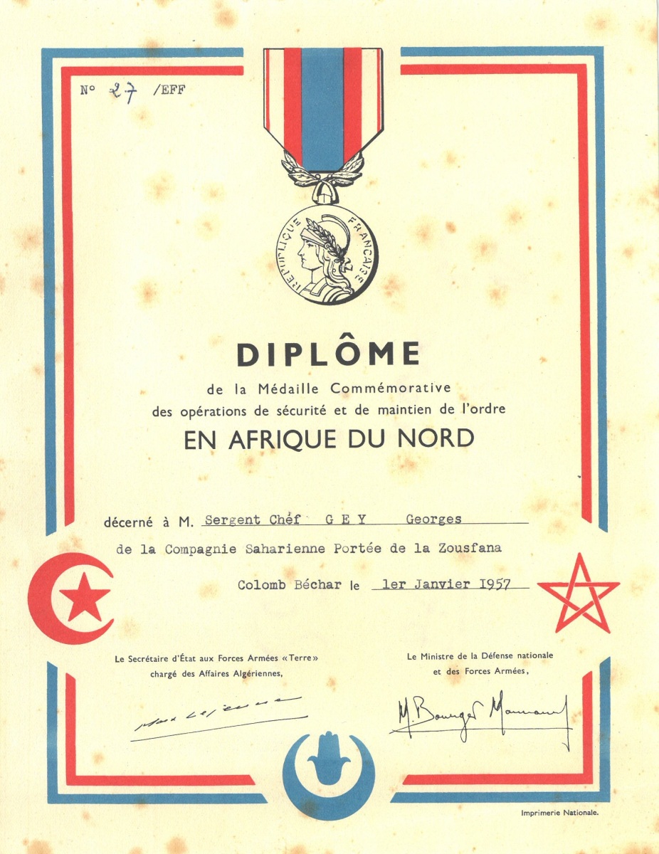 Ce fragment a été rapporté d'Algérie par l'adjudant Georges Gey (né à Paris en 1927). On joint à ce souvenir une photographie colorisée de l'djudant Gey; son brevet de Chef de Section délivré à Alger le 18 novembre 1955; son diplôme de la Médaille Commémorative des opérations de sécurité et de maintien de l'ordre en Afrique du Nord délivré à Colomb Béchar le 1er janvier 1957 et son brevet de la médaille militaire délivré le 4 décembre 1959.