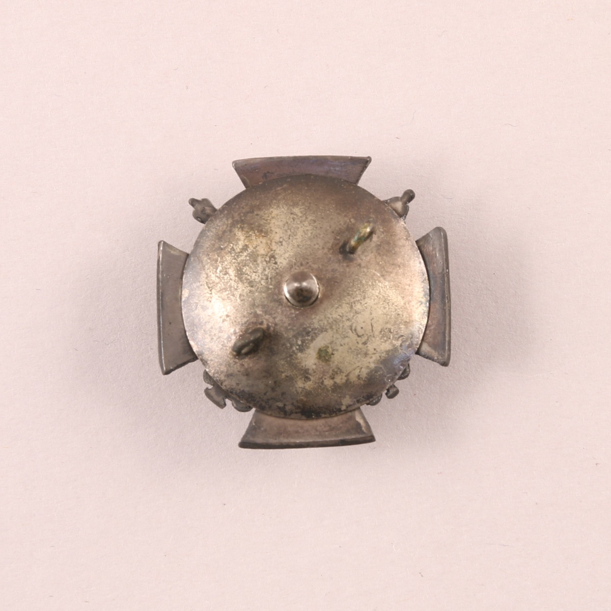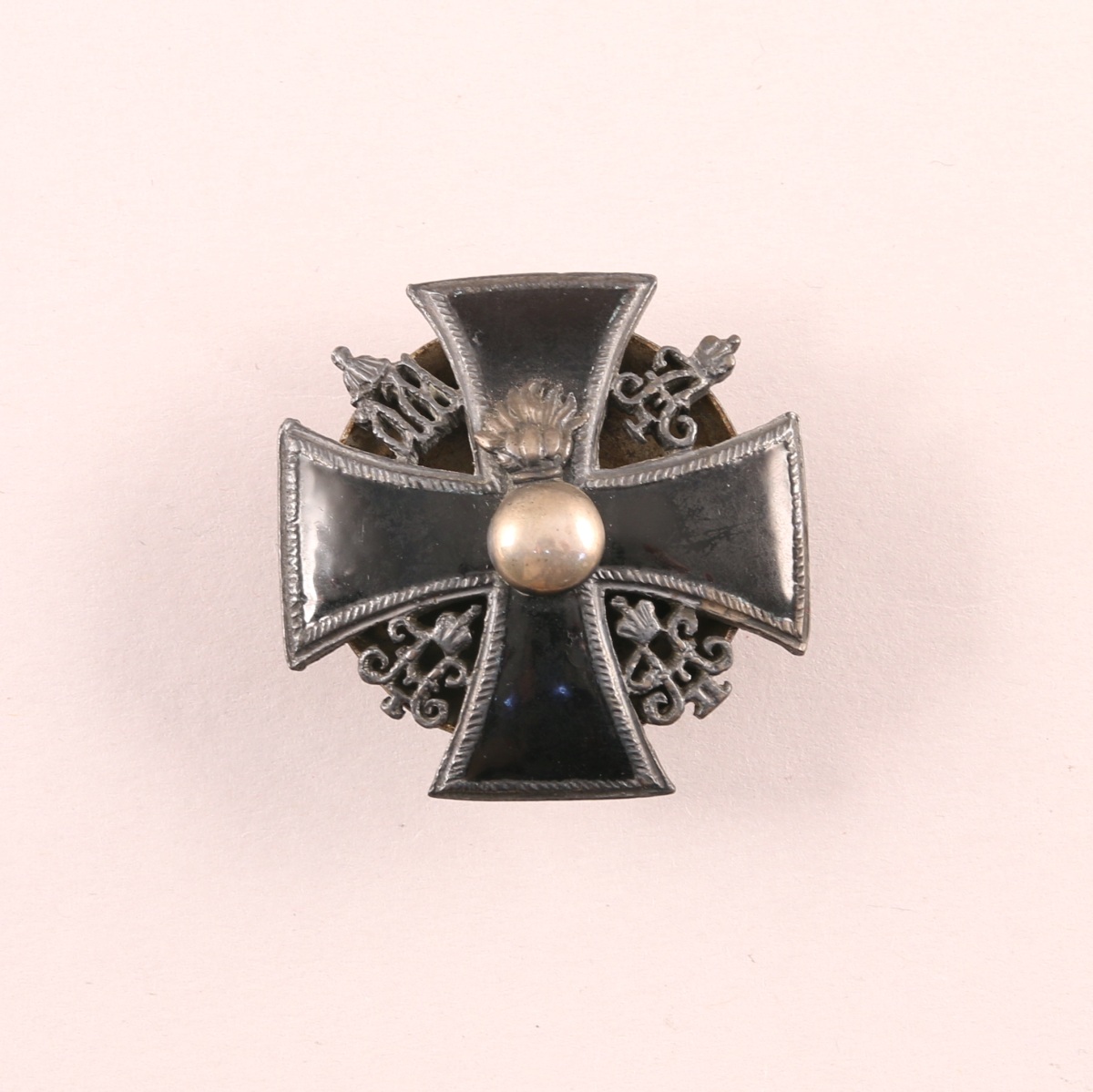 RUSSIE - INSIGNE DU RÉGIMENT DES GRENADIERS À CHEVAL DE LA GARDE IMPÉRIALE en forme de croix de Kulm (Croix de Fer) en métal argenté émaillé noir, chargée d'une grenade enflammée en métal doré, anglée des monogrammes des empereurs, Alexis Mikhailovitch, Alexandre Ier, Nicolas Ier et Nicolas II, fixation par vis et écrou.