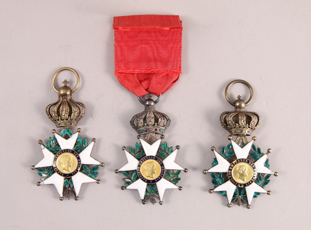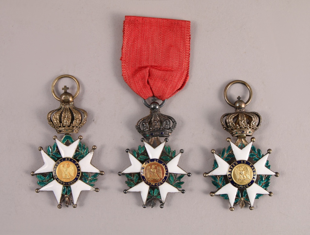 FRANCE. ORDRE DE LA LÉGION D'HONNEUR, Second Empire, LOT DE TROIS ÉTOILES de chevalier en argent et émail, les centres en or (éclats épars, quelques pommettes faussées), une avec ruban, variantes dans les couronnes. TB.