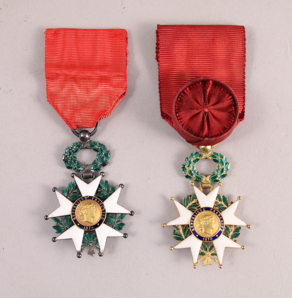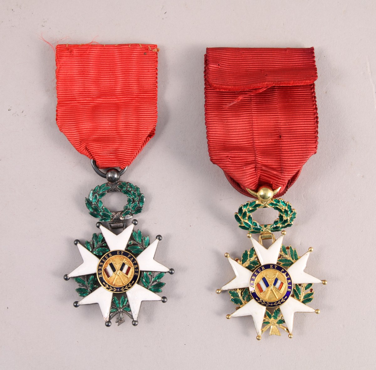 FRANCE. ORDRE DE LA LÉGION D'HONNEUR, IIIe République, LOT DE DEUX : une étoile d'officier en or et émail, poinçon à la tête d'aigle, ruban à rosette ; une étoile de chevalier en argent et émail, centres en or (éclats et pommettes faussées), ruban. TTB et TB.