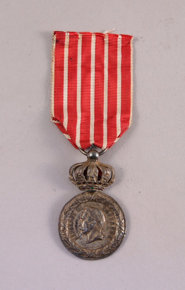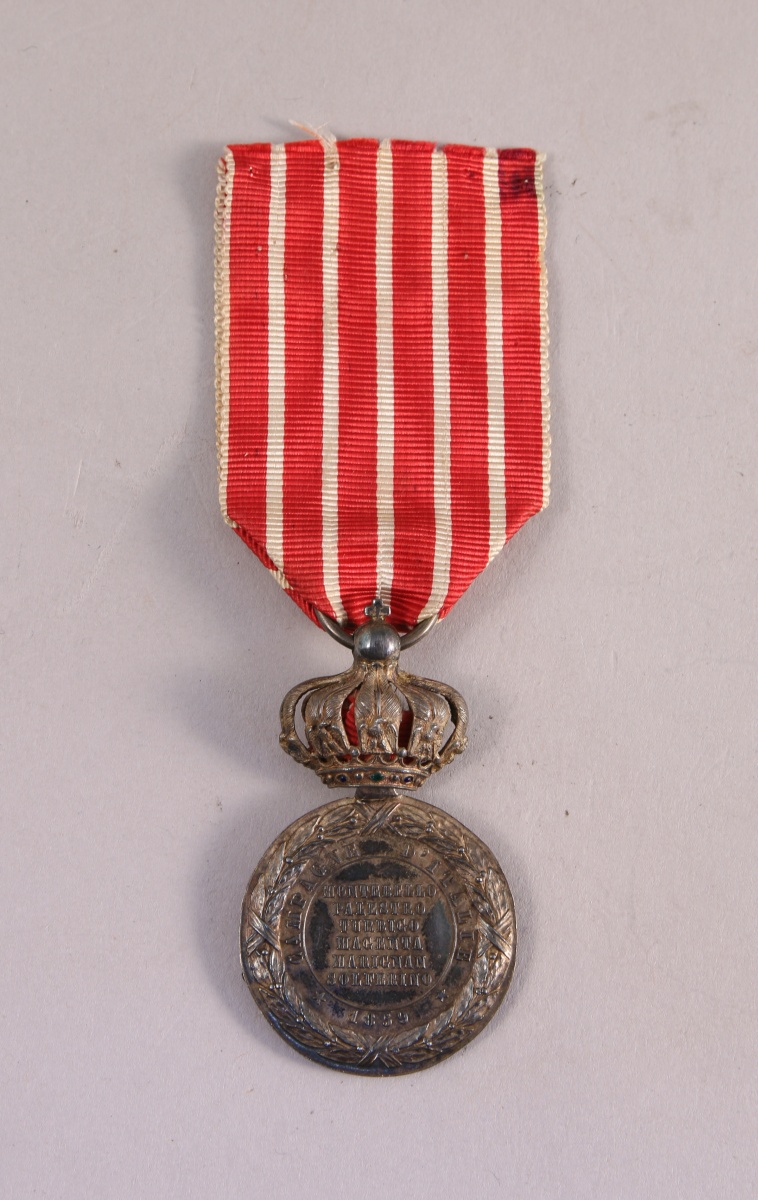 FRANCE. MÉDAILLE COMMÉMORATIVE DE LA CAMPAGNE D'ITALIE, 1859, second modèle dit "des cent-gardes" signé Sacristain, au profil lauré de Napoléon III, flan large, surmontée d'une couronne articulée, ruban.
