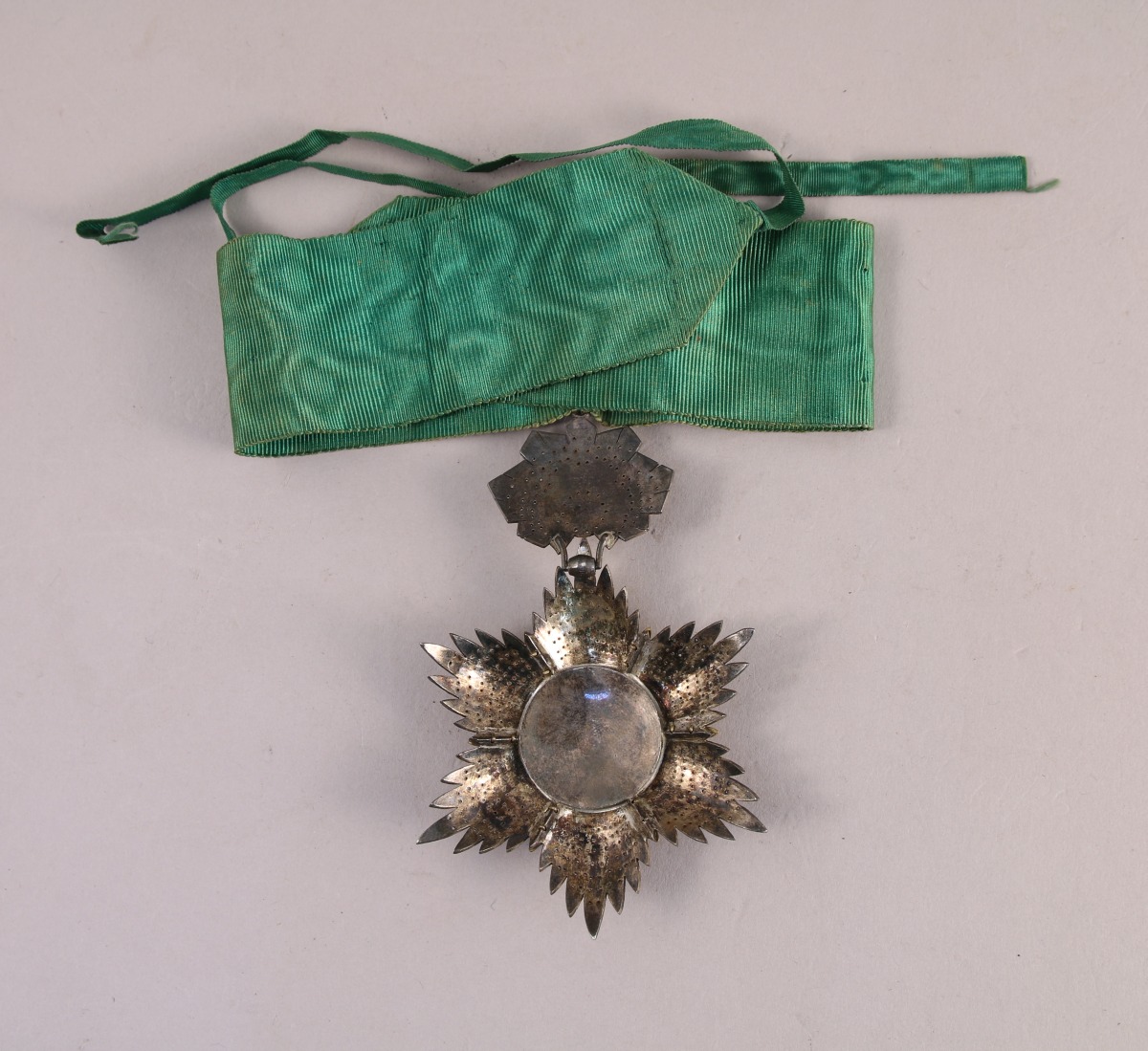 PERSE. ORDRE DU LION ET DU SOLEIL, bijou de commandeur militaire en forme d'étoile à six pointes, portée verticalement, en argent travaillé en pointes de diamants ajourées, anglée de rais émaillés vert, le centre, dans un double cerclage diamanté, est orné du lion debout portant un sabre, devant le soleil surmonté de la couronne impériale Quajar. Cravate complète. Rare fabrication européenne.