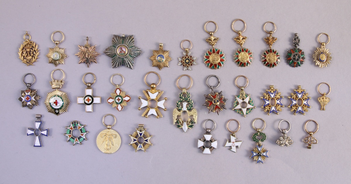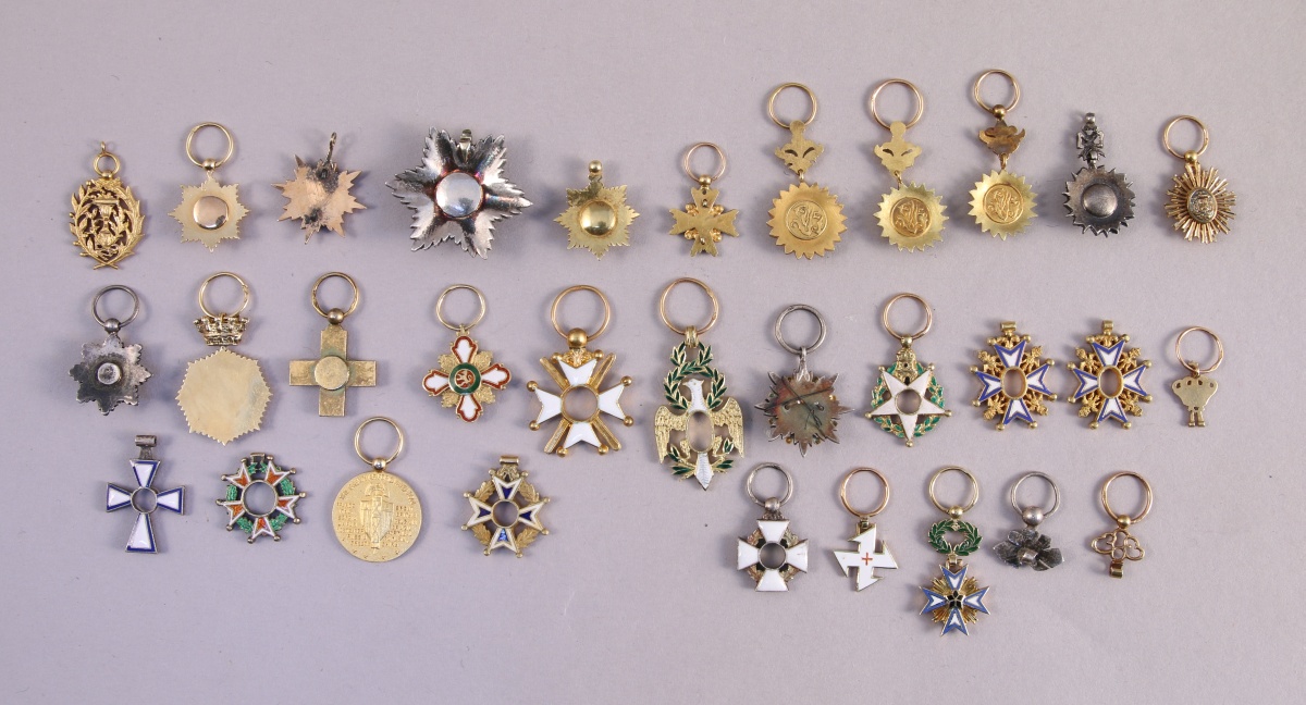 - RÉUNION de NEUF RÉDUCTIONS en or émaillé dont États-Unis - Médaille Interalliée 1914-1918 (2,4 g); Portugal - Ordre Militaire de la Tour et de l'Épée... Haut : entre 2,6 et 10 mm. Poids brut total : 18,3 g. (manques, accidents, en l'état)