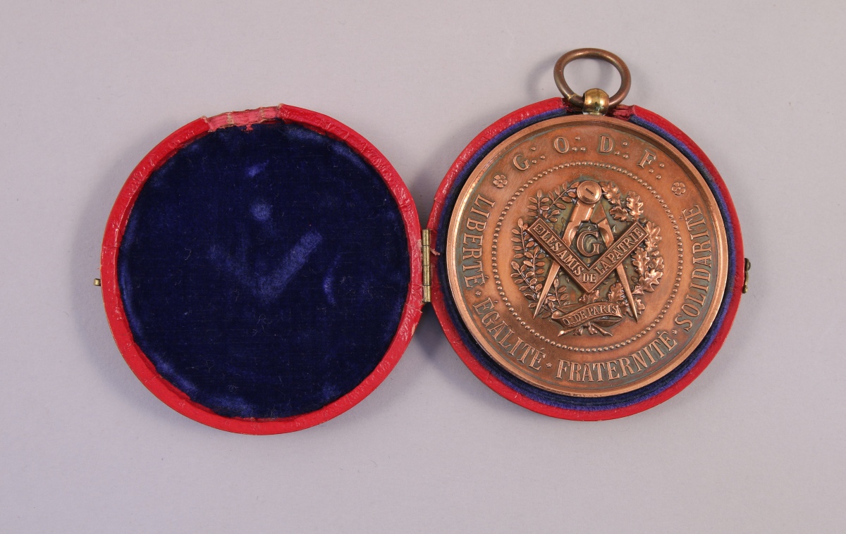 - MÉDAILLE en cuivre : A/ G.: O.: D.: F.: Liberté Égalité Fraternité Solidarité / Les amis de la patrie O.: de Paris - R/ L.: Les amis de la patrie Enseignement moral et civique / 1895 4e médaille d'honneur Haisteault Clotilde. Anneau de bélière. Dans un écrin monogrammé "HC". Diam. 5,5 cm.