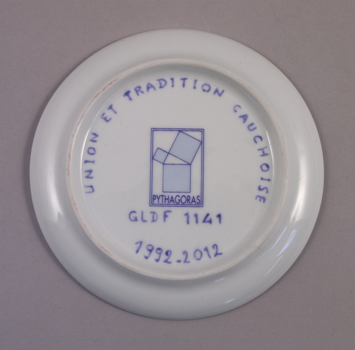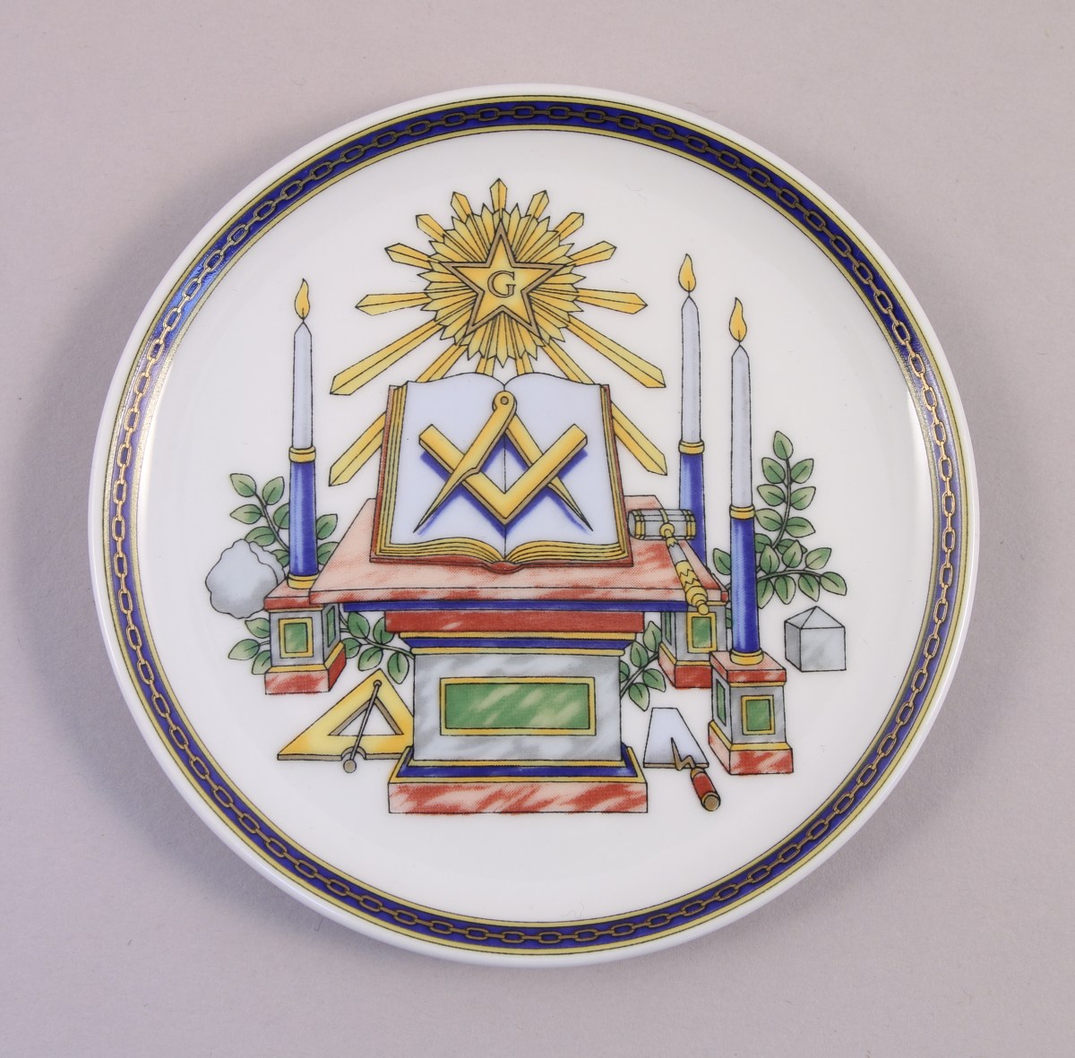 JOINT : COUPELLE en porcelaine à décor polychrome d'attributs maçonniques. Marquée au revers : "Union et tradition cauchoise / GLDF 1141 / 1992-2012". Diam. 10 cm.