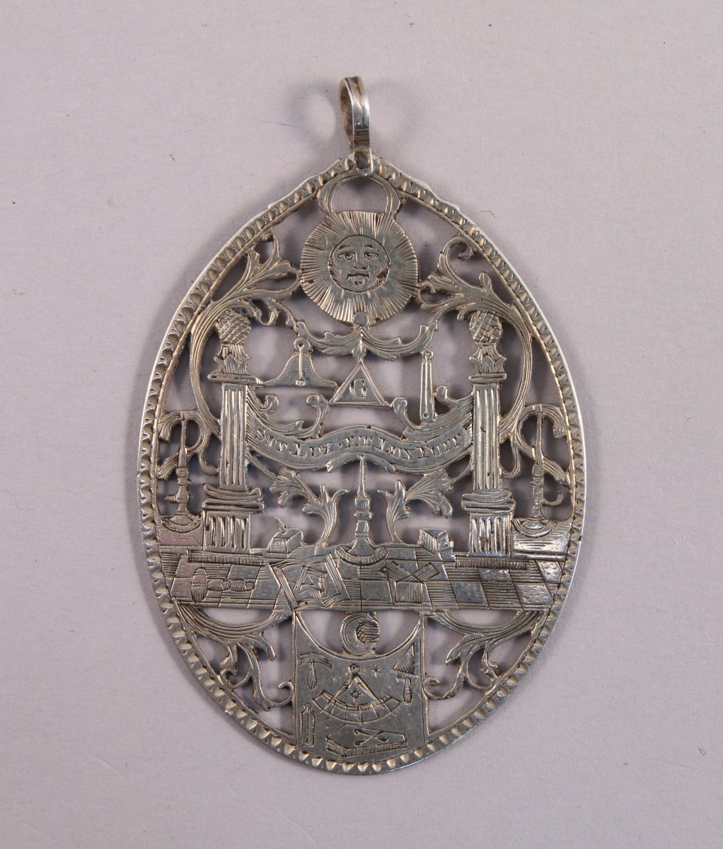 FRANC-MAÇONNERIE. PENDENTIF de forme ovale en argent finement ciselé et ajouré d'attributs maçonniques dans des rinceaux. Inscription "Sit lux et lux fuit / James * Edgar".