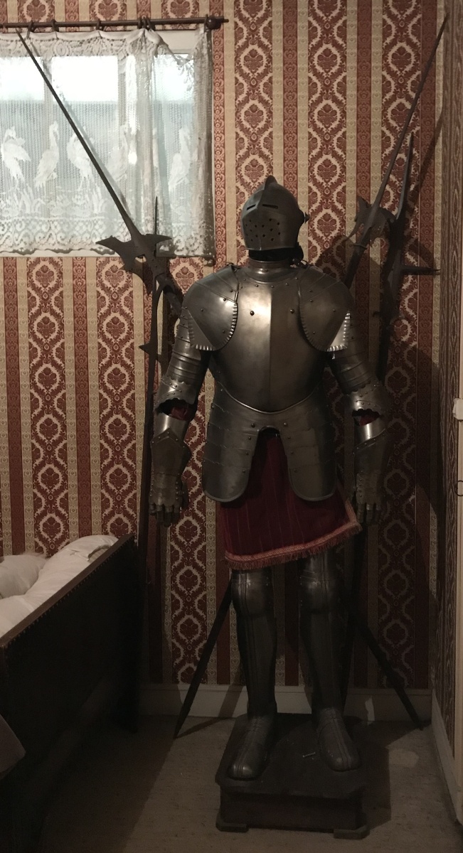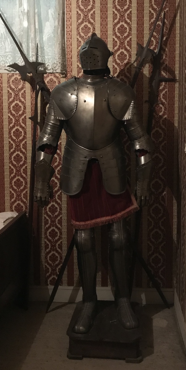 ARMURE articulée en pied. En fer, elle se compose d'un armet à crète et vantail ajouré, colletin, plastron, spallières, brassards, cubitières, gantelets, braconnière, cuissots, genouillères, jambières et solerets. Présentée sur un socle en bois.