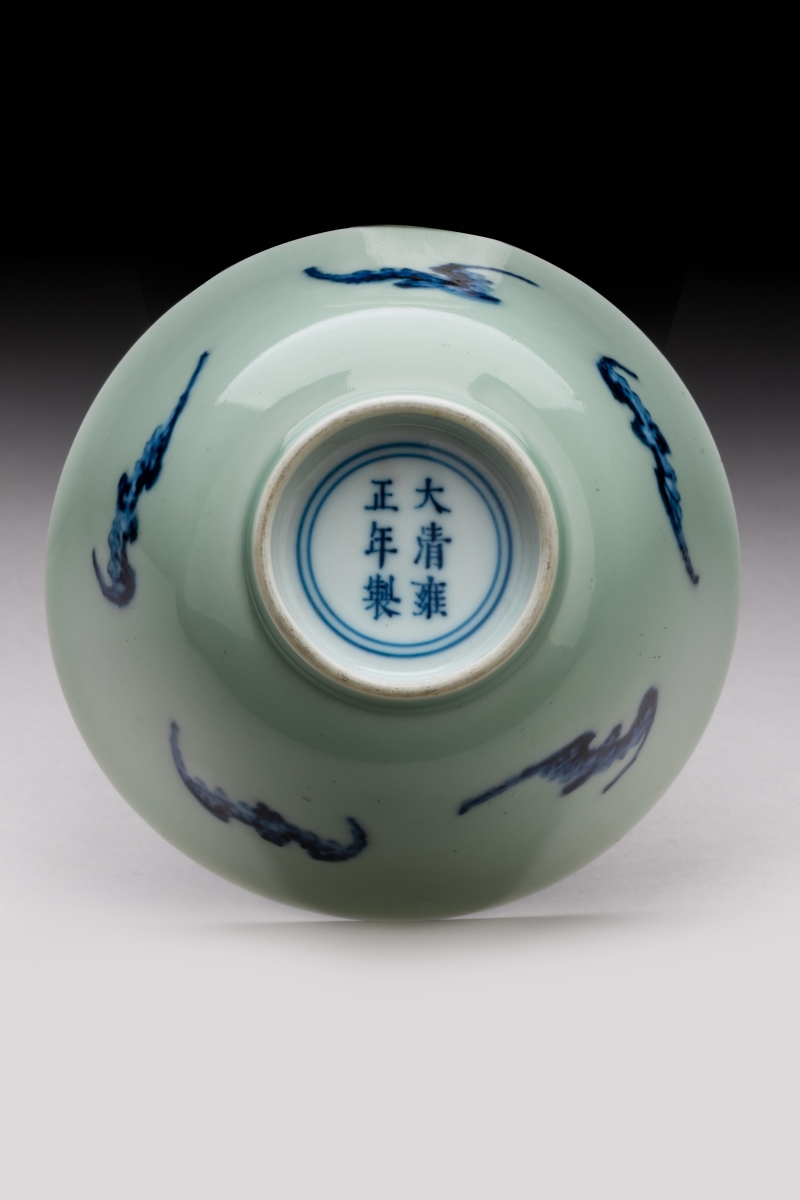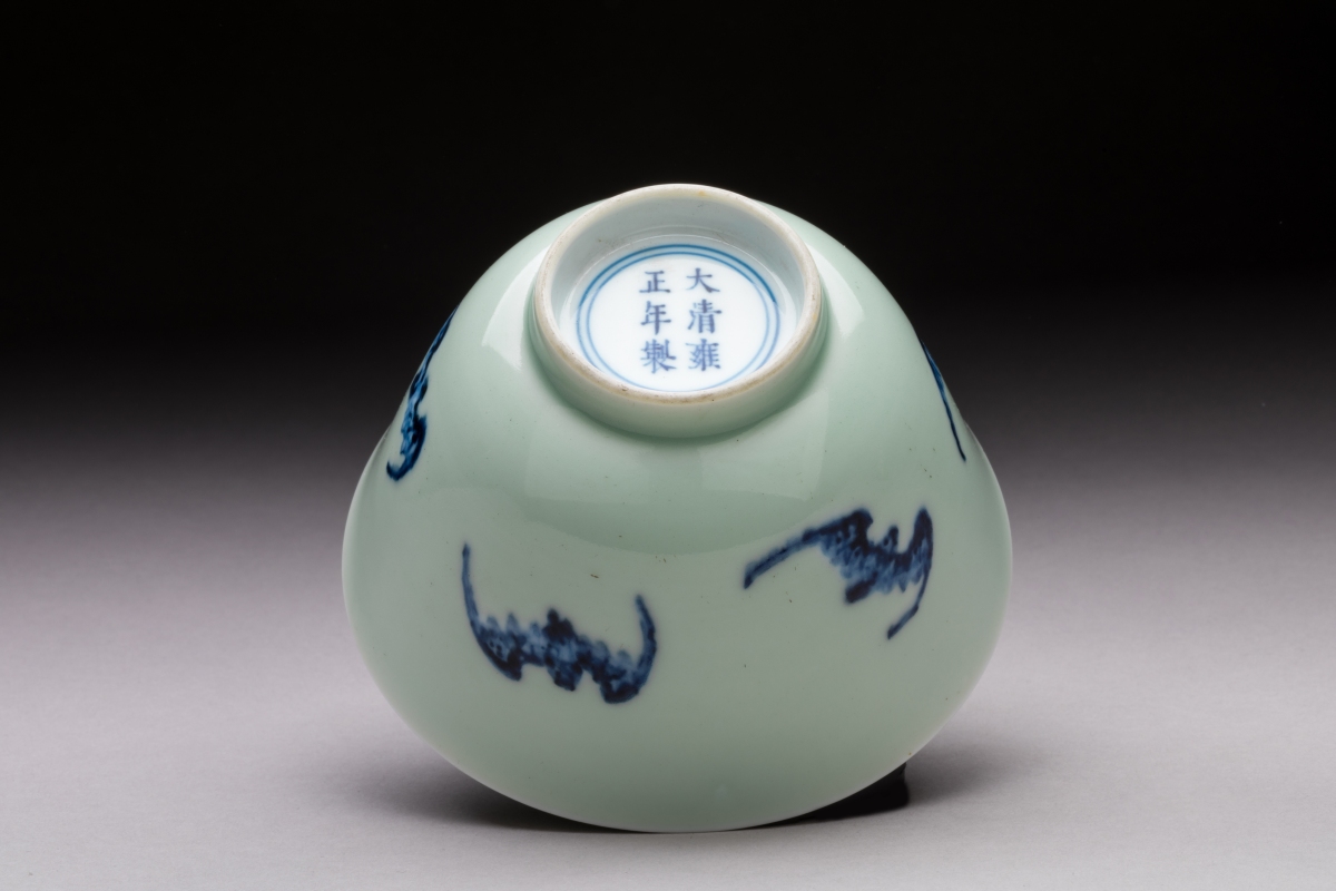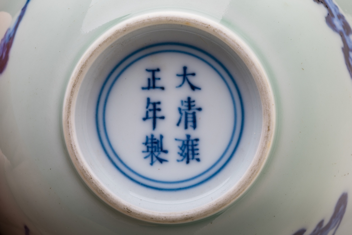 Au revers de la base, la marque à six caractères en kaishu en bleu sous couverte de Yongzheng.