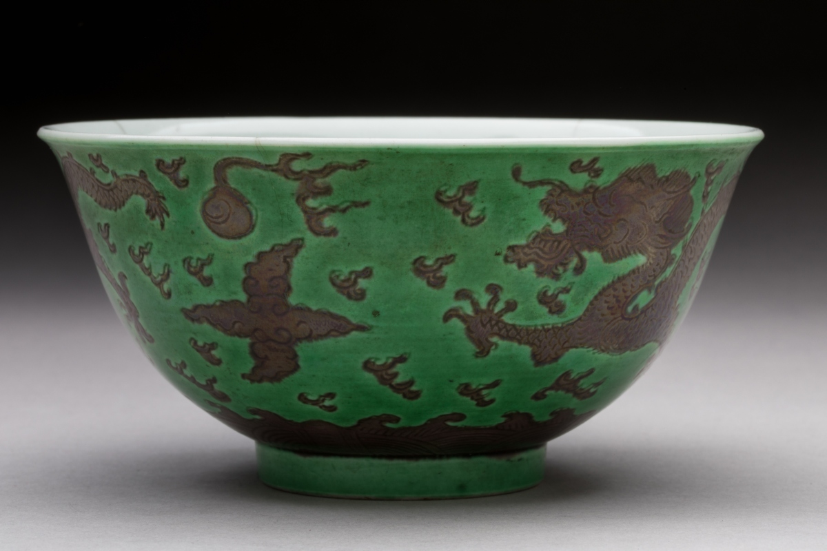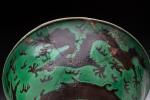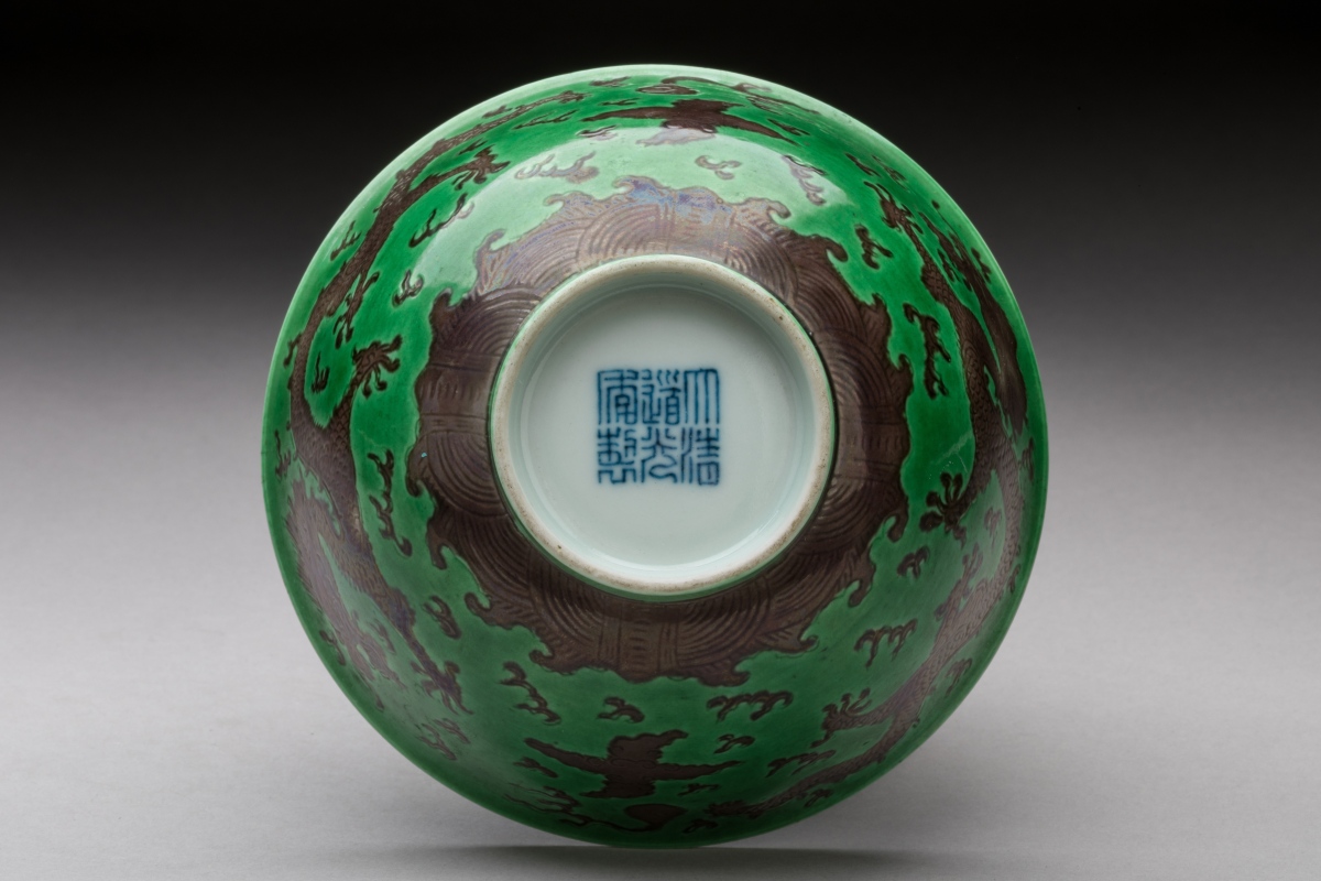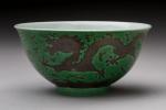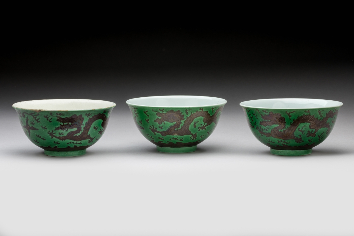 CHINA, DAOGUANG period. Three green and manganese enameled porcelain BOWLS decorated with dragons chasing after the sacred pearl. Daoguang six-character seal mark in zhuanshu script on the base.